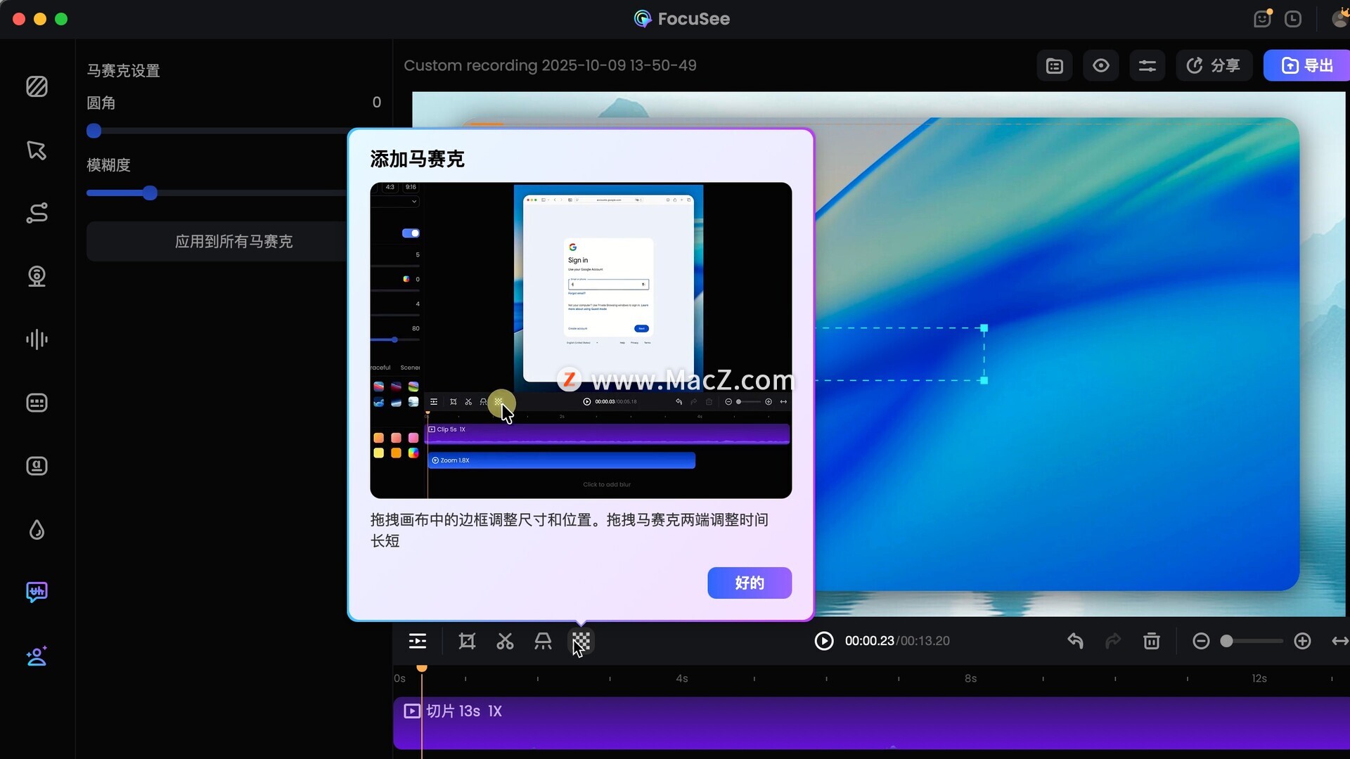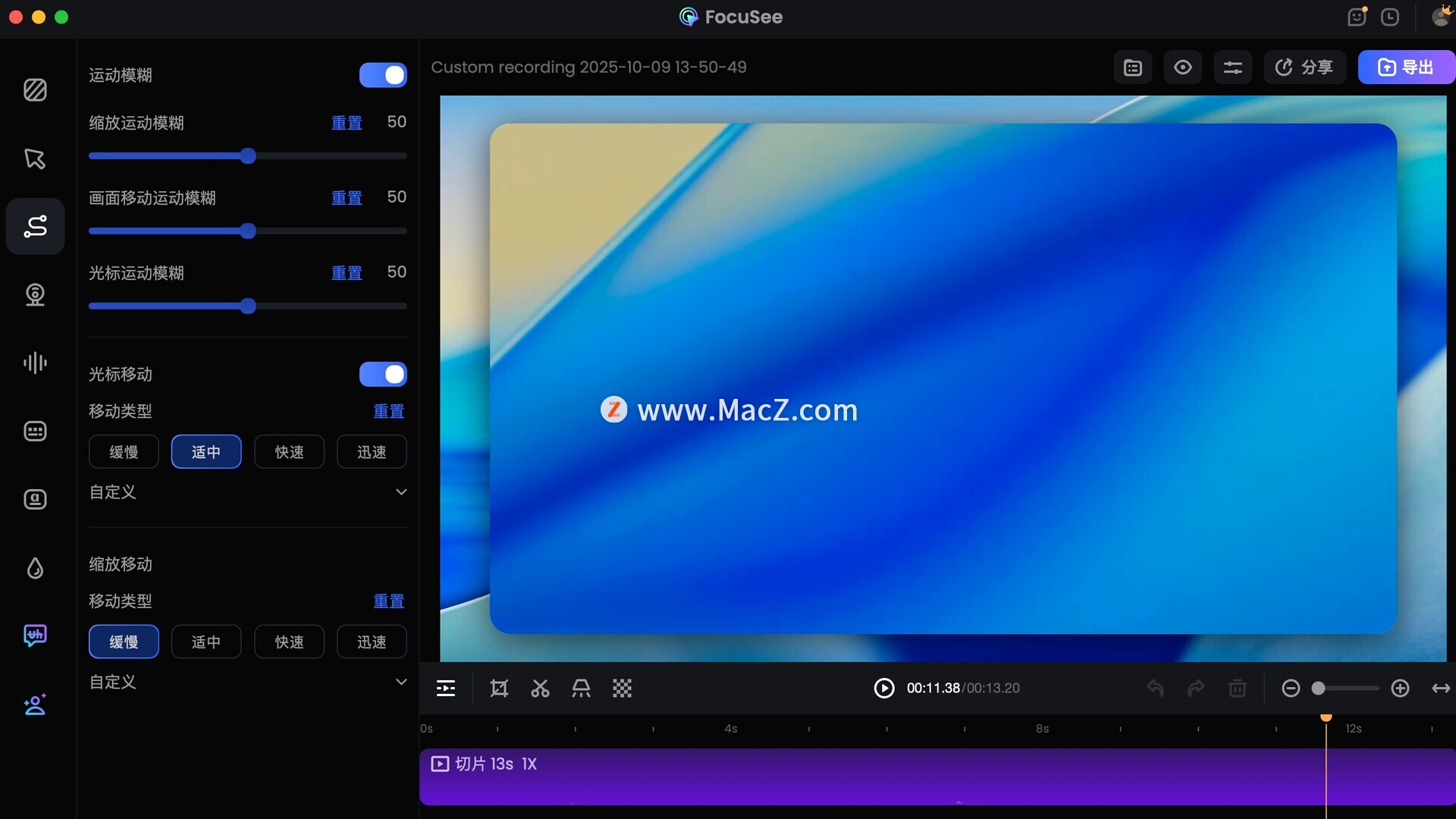 FocusSee for mac一款智能屏幕录制与编辑工具,可用于制作引人注目的产品视频。它允许您录制全屏、自定义区域或带有自动放大效果的窗口。停止录制后,您可以访问视频编辑界面,在导出之前增强视频效果。测试环境:MacOS 15.5