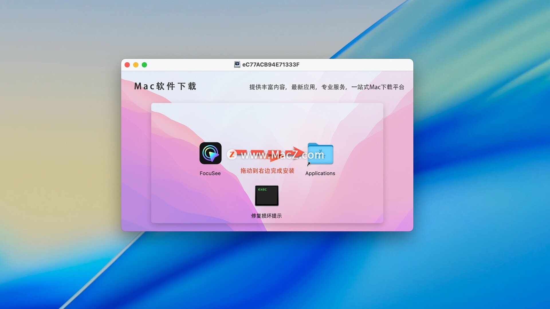 FocusSee mac破解版下载完成后打开,拖动左侧的软件到右侧应用程序中即可