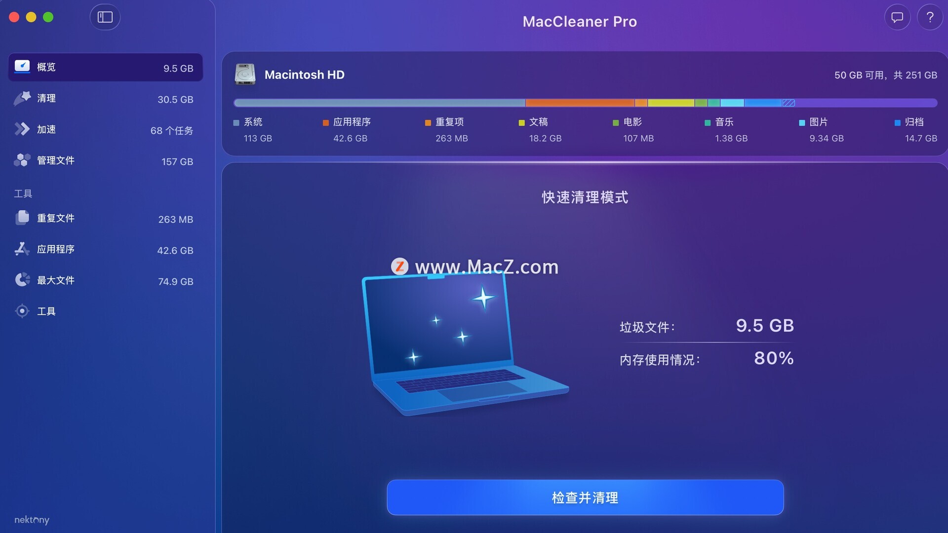 MacCleaner Pro for Mac一款专为 macOS 用户设计的系统优化与清理工具,旨在帮助用户轻松管理磁盘空间、优化系统性能。它能够扫描并清理无用文件、缓存、日志、重复文件以及大文件,让 Mac 保持轻盈运行。