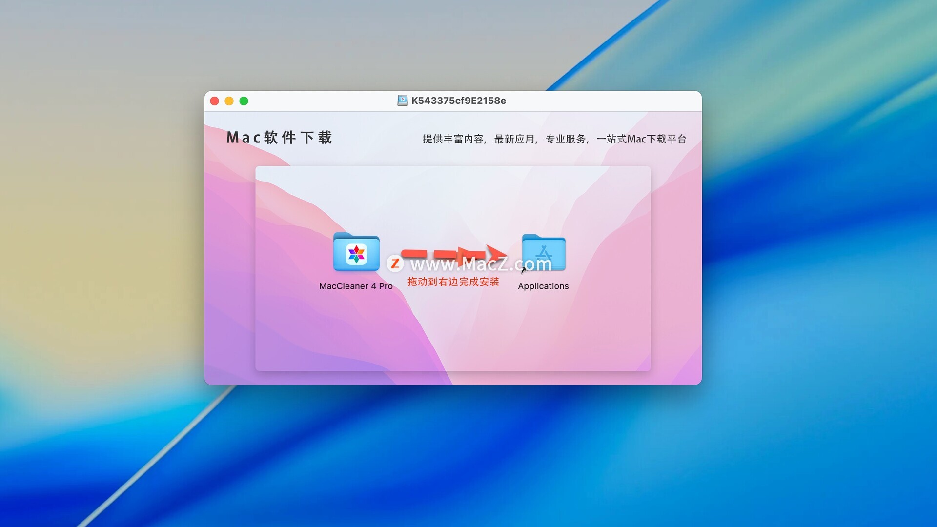 MacCleaner Pro下载完成后打开,拖动左侧的文件夹到右侧应用程序中即可