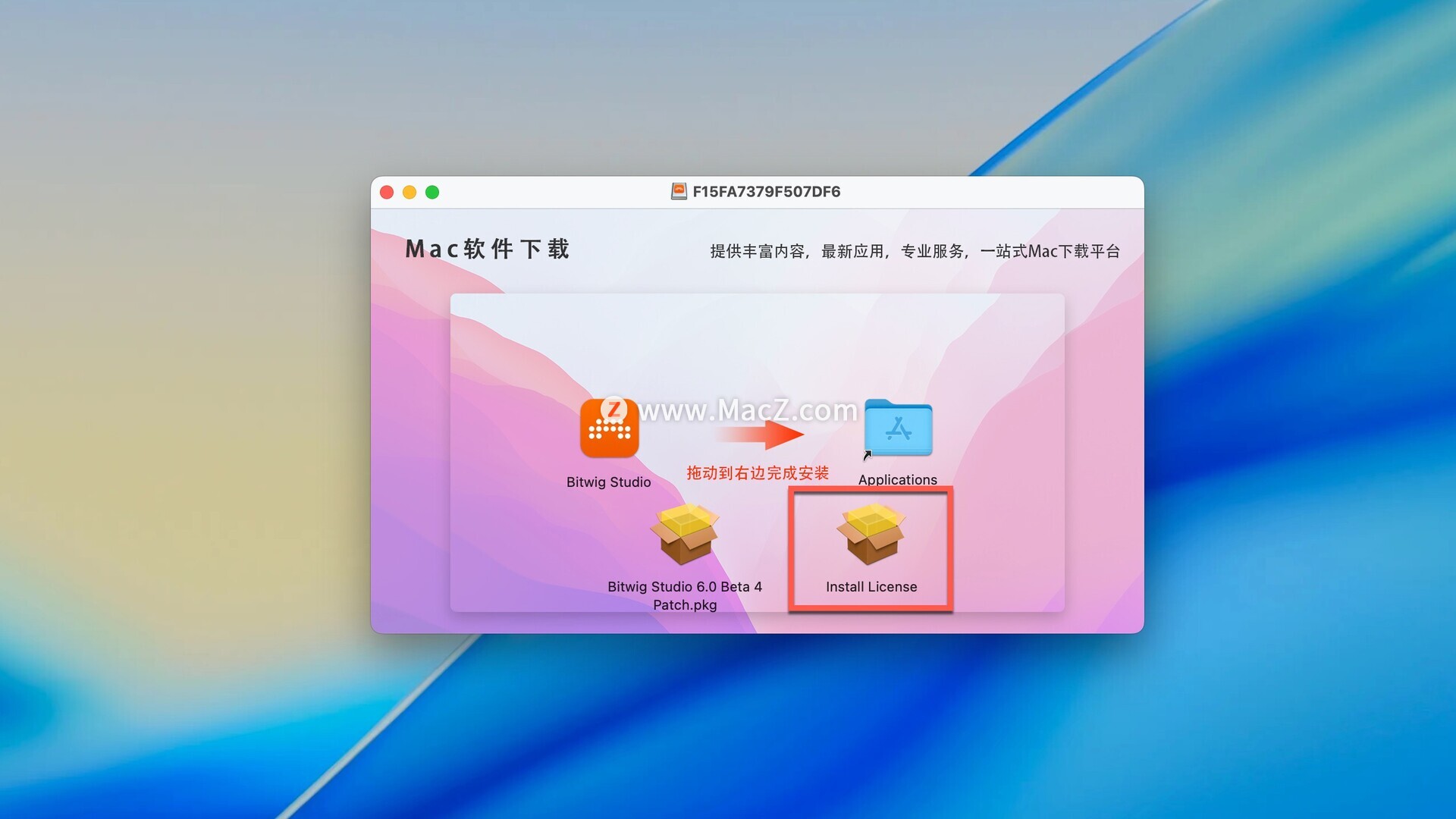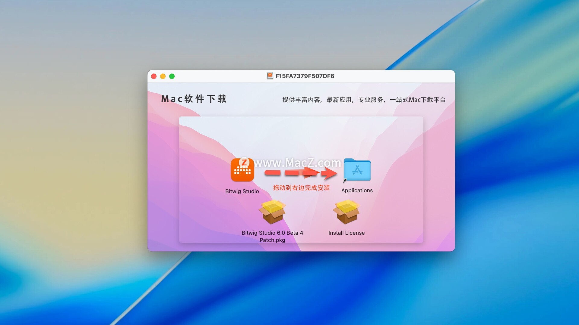 Bitwig Studio6破解版下载完成后打开,拖动左侧的软件到右侧应用程序中即可