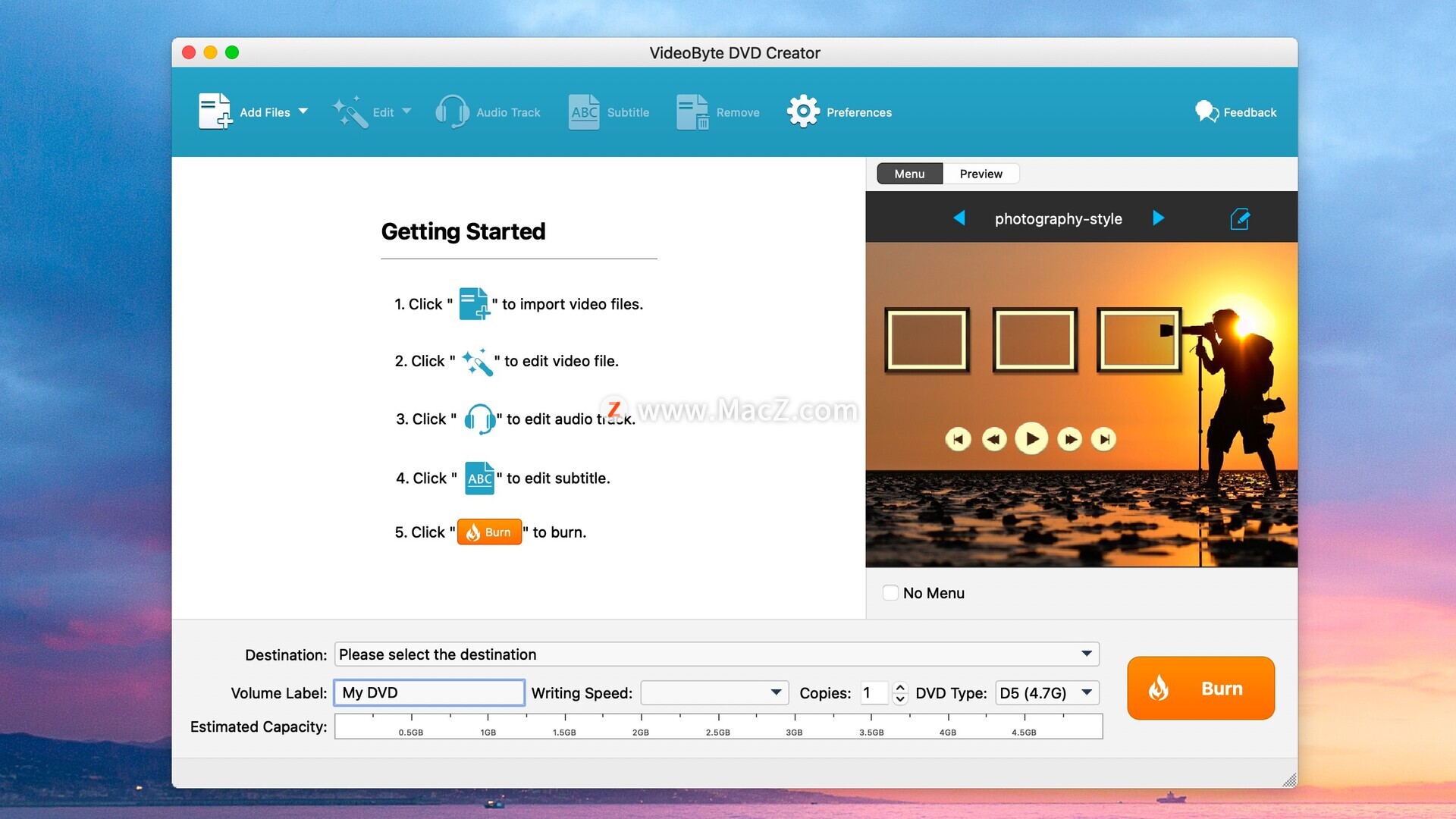 在刻录 DVD 之前,VideoByte DVD Creator 提供多种编辑功能和 DVD 菜单模板,让您能够创建高质量内容并自定义 DVD 菜单,以便查看您想要的任何部分。VideoByte DVD Creator 是一款专业、快速且易于使用的解决方案,可用于备份数据和构建本地收藏。