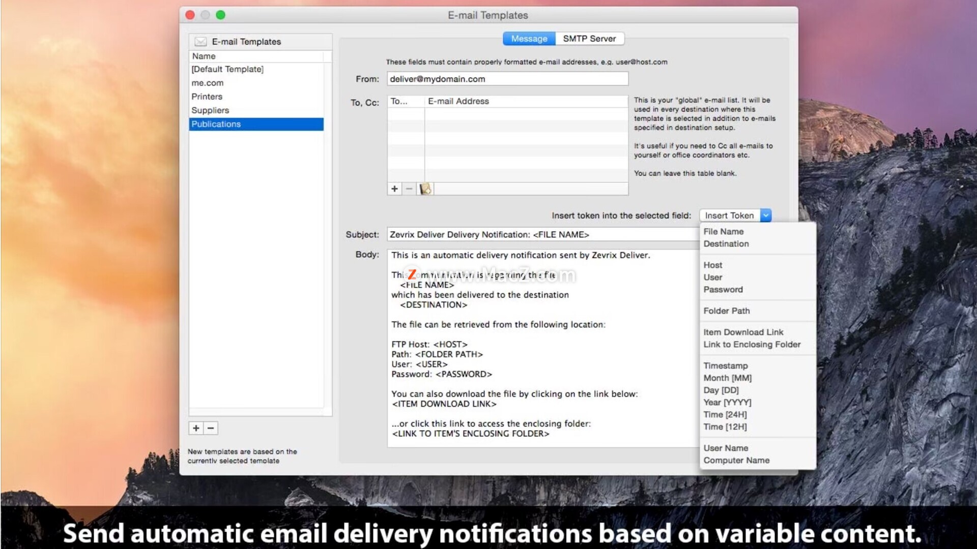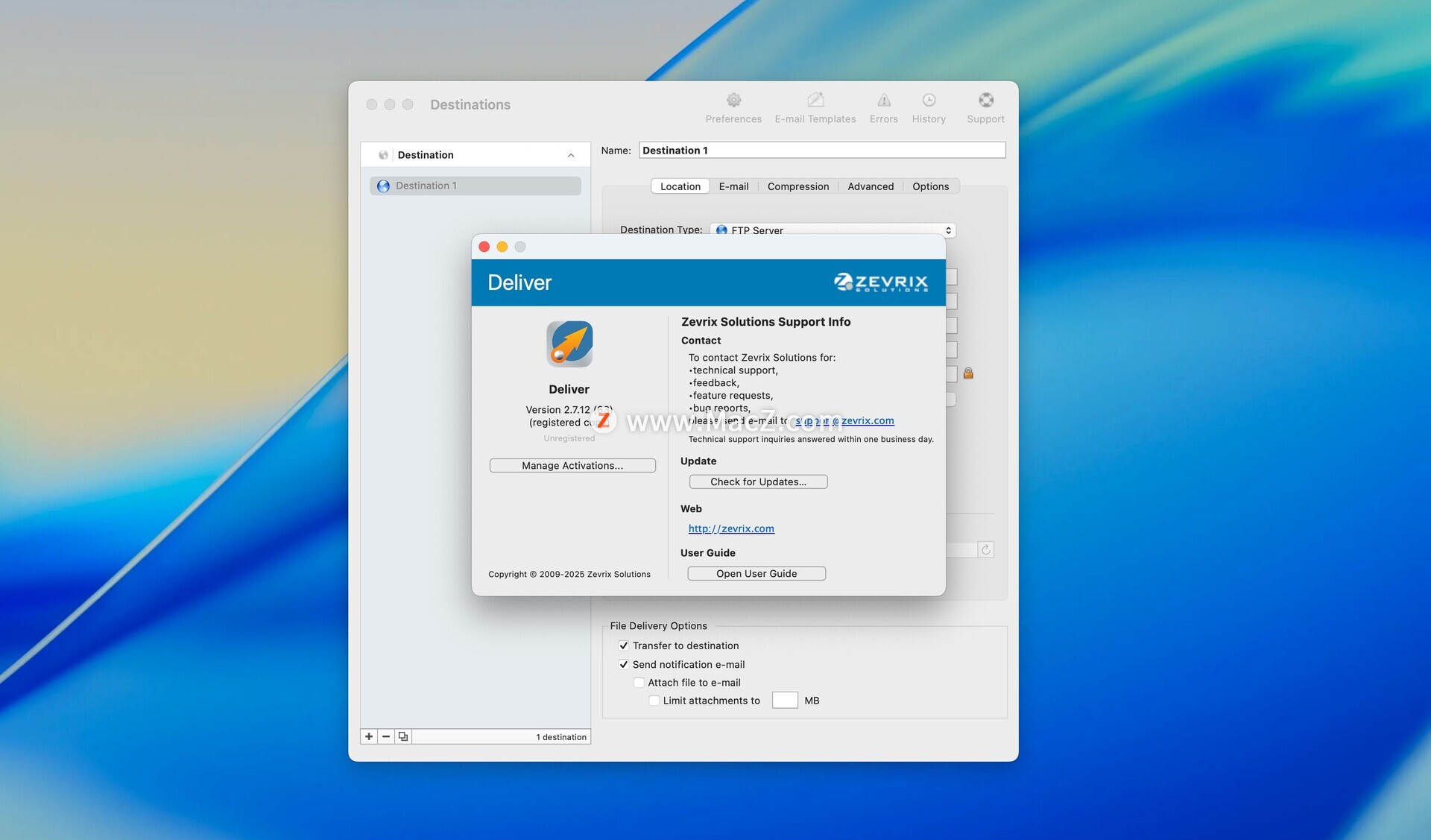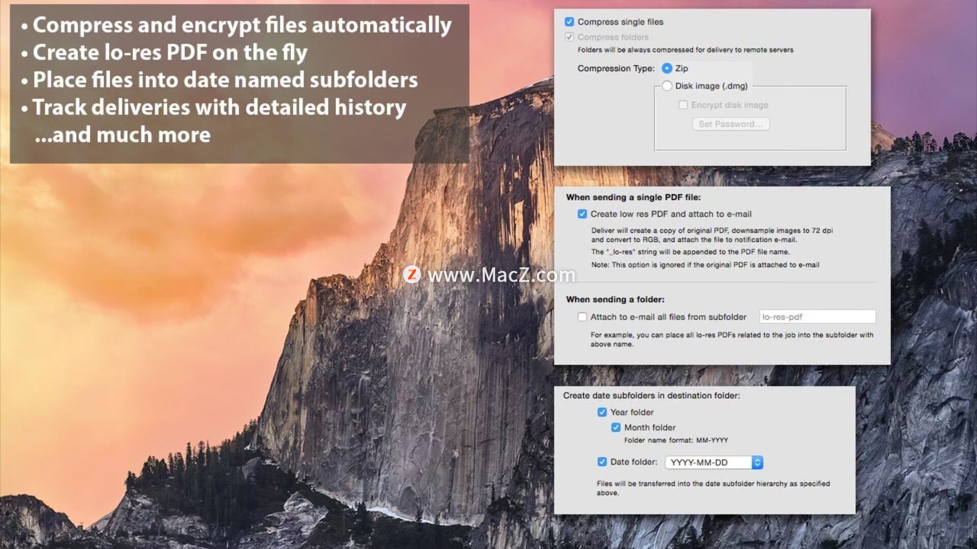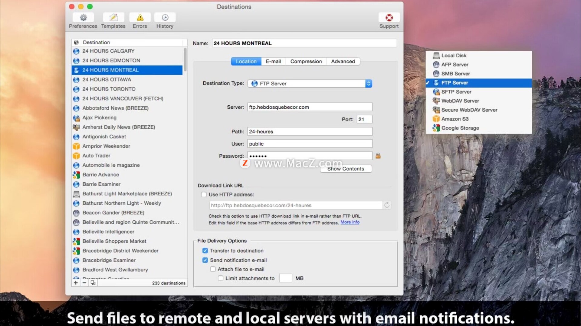 Deliver for Mac是一款优秀的ftp工具,Deliver mac版支持FTP、SFTP、Amazon S3和其他主要服务,能够通过Internet和本地网络轻松共享文件,另外Deliver for mac还支持自动电子邮件通知、指定天数后自动删除文件、自动zip/dmg压缩、使用密码加密磁盘映像等功能。