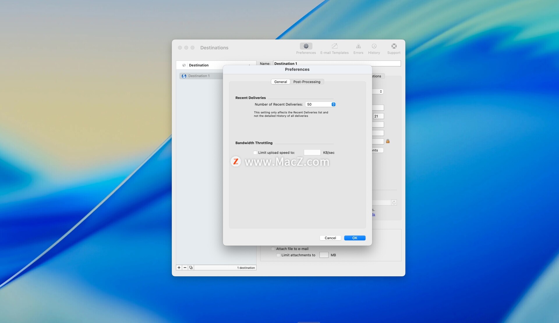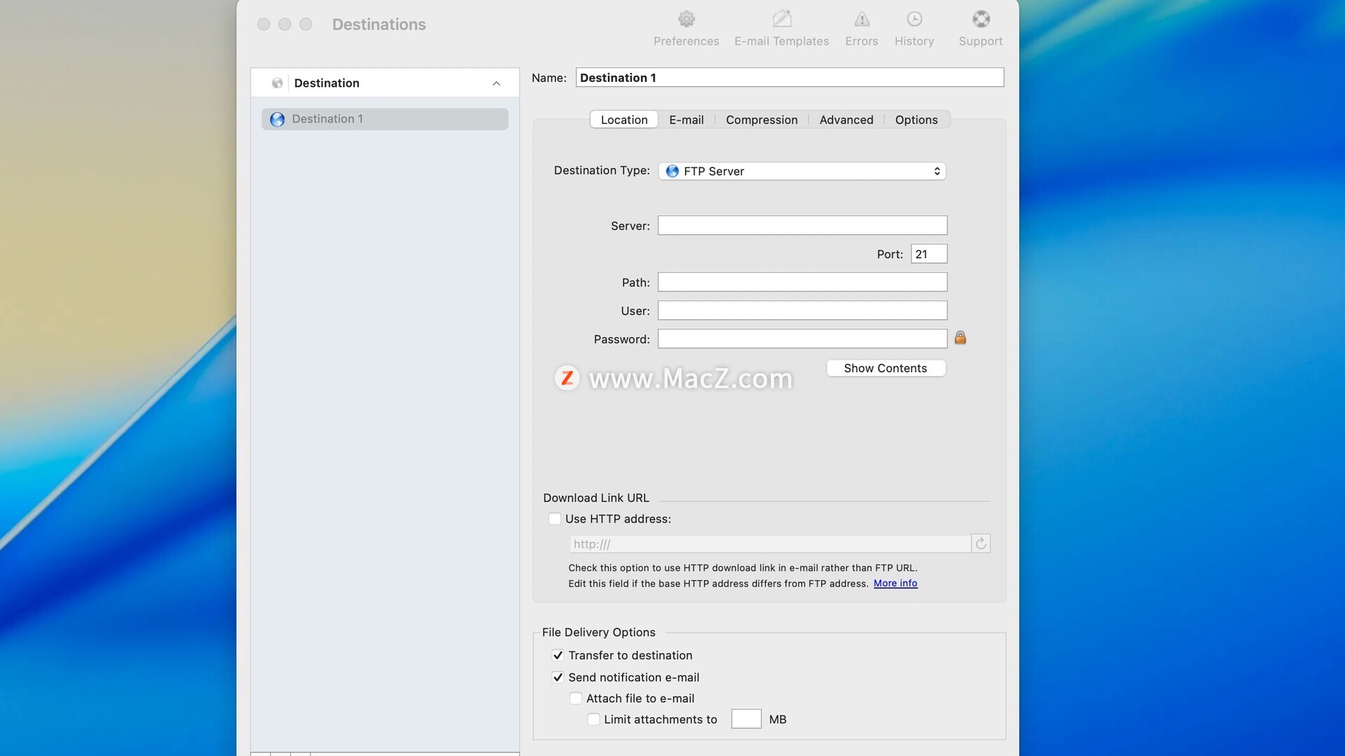 支持 FTP、SFTP、WebDAV、Google Storage、Amazon S3、AFP、SMB 和本地目的地