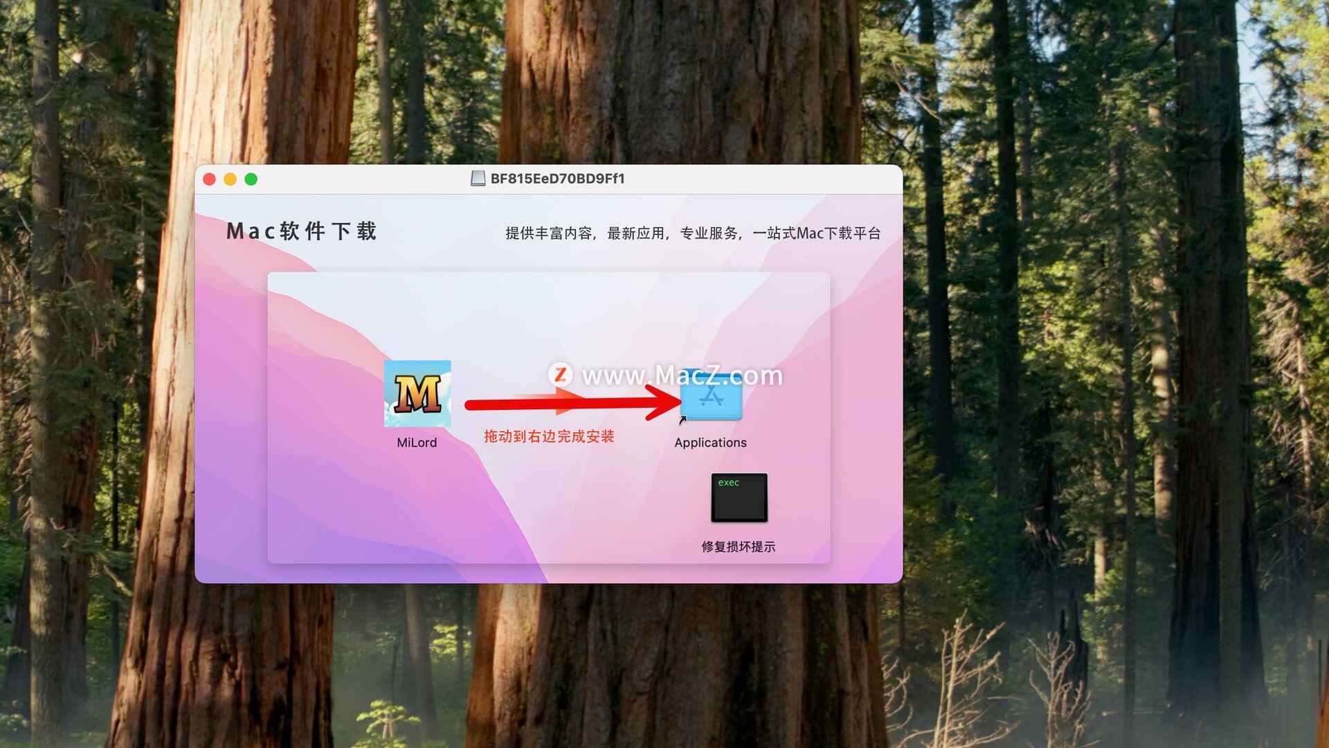将左侧的Milord拖动到右侧的应用程序中,如图