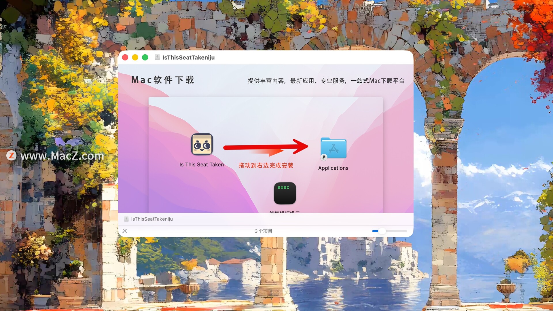 将左侧的Is This Seat Taken拖动到右侧的应用程序中即可