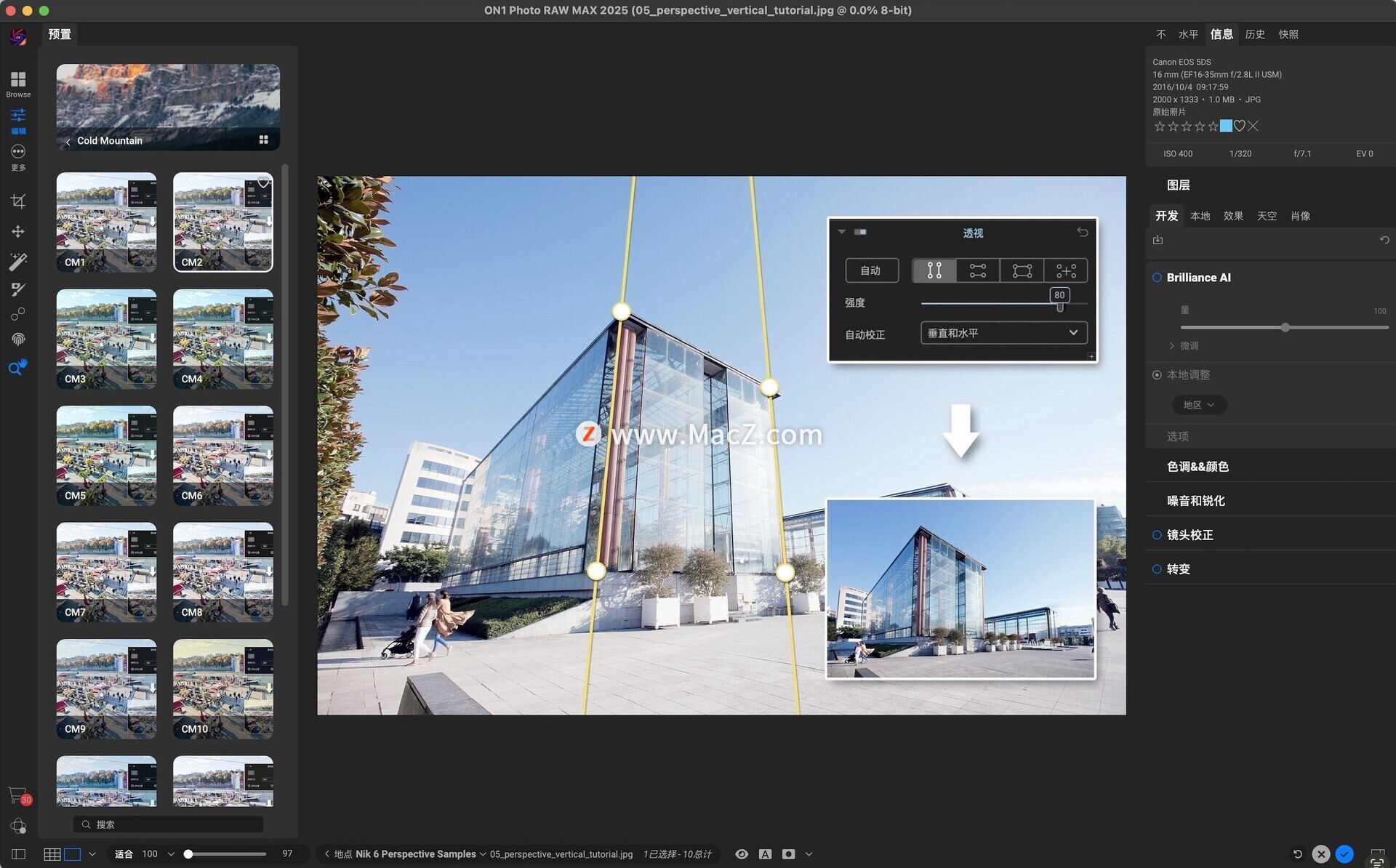 - 在 ON1 Photo RAW 2026 中轻松修复透视——全新工具,告别黑角,呈现完美线条。