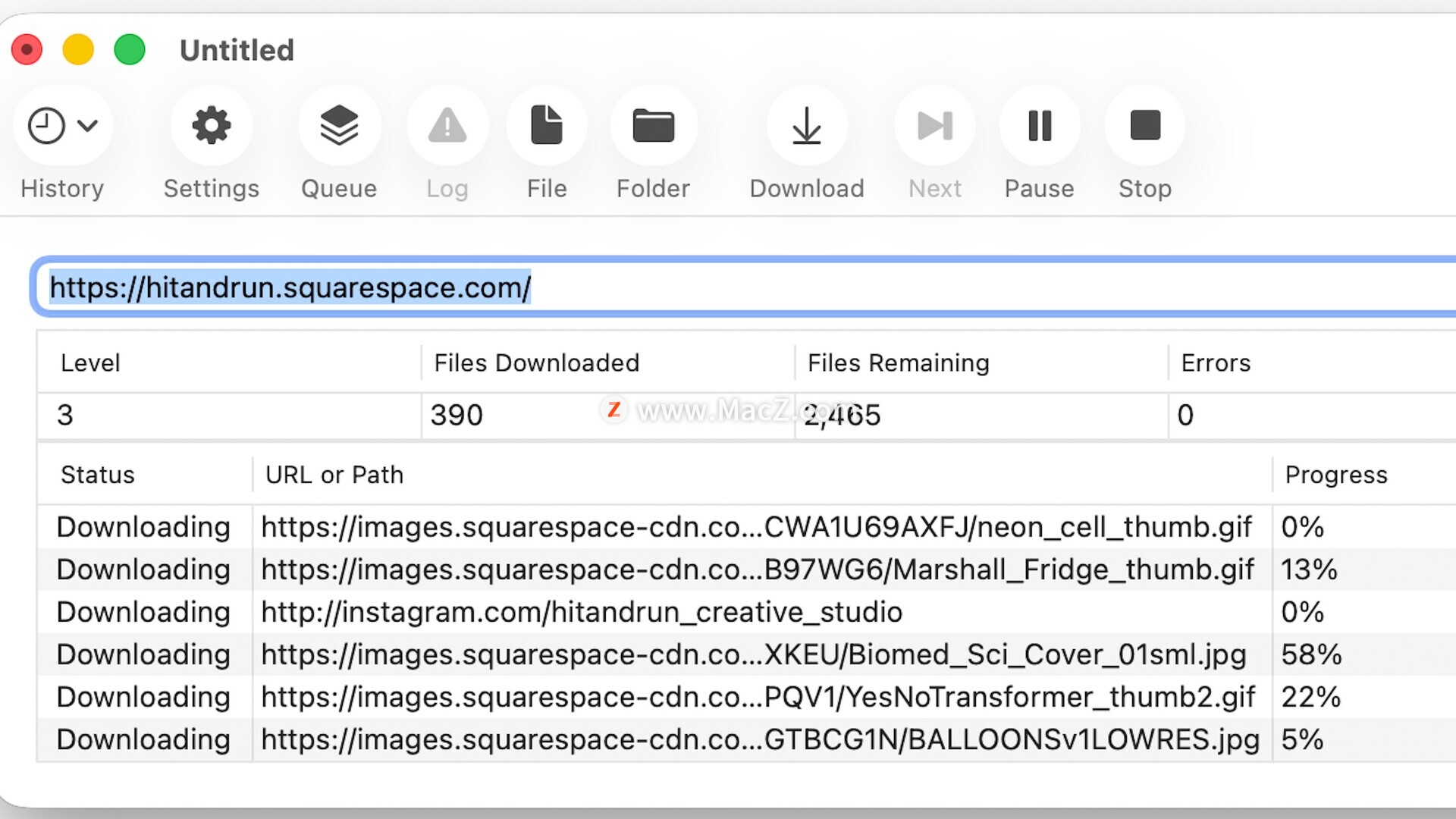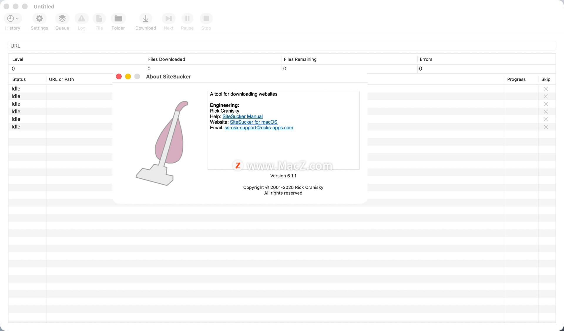 SiteSucker软件操作非常简单,输入网站网址,敲回车就开始下载了,而且自定义设置颇为丰富,如果你在一次Download过程中暂停或停止下载,可以在History菜单里找到记录接着进行下载,下载过程里可以对列表里的文件采取跳过操作(Skip)。