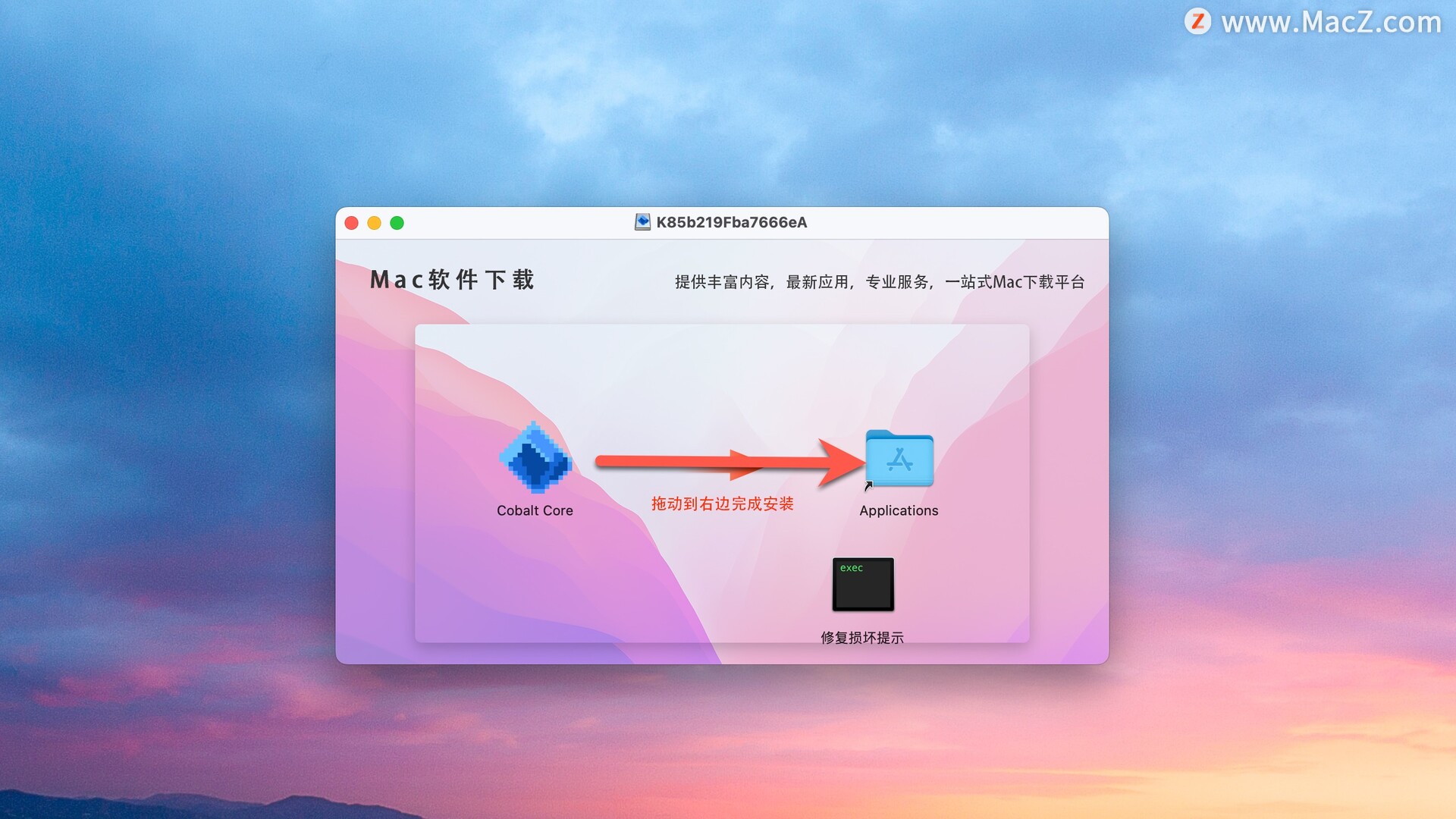 安装包下载完成后打开 ,将左侧文件拖动到右侧文件夹中即可