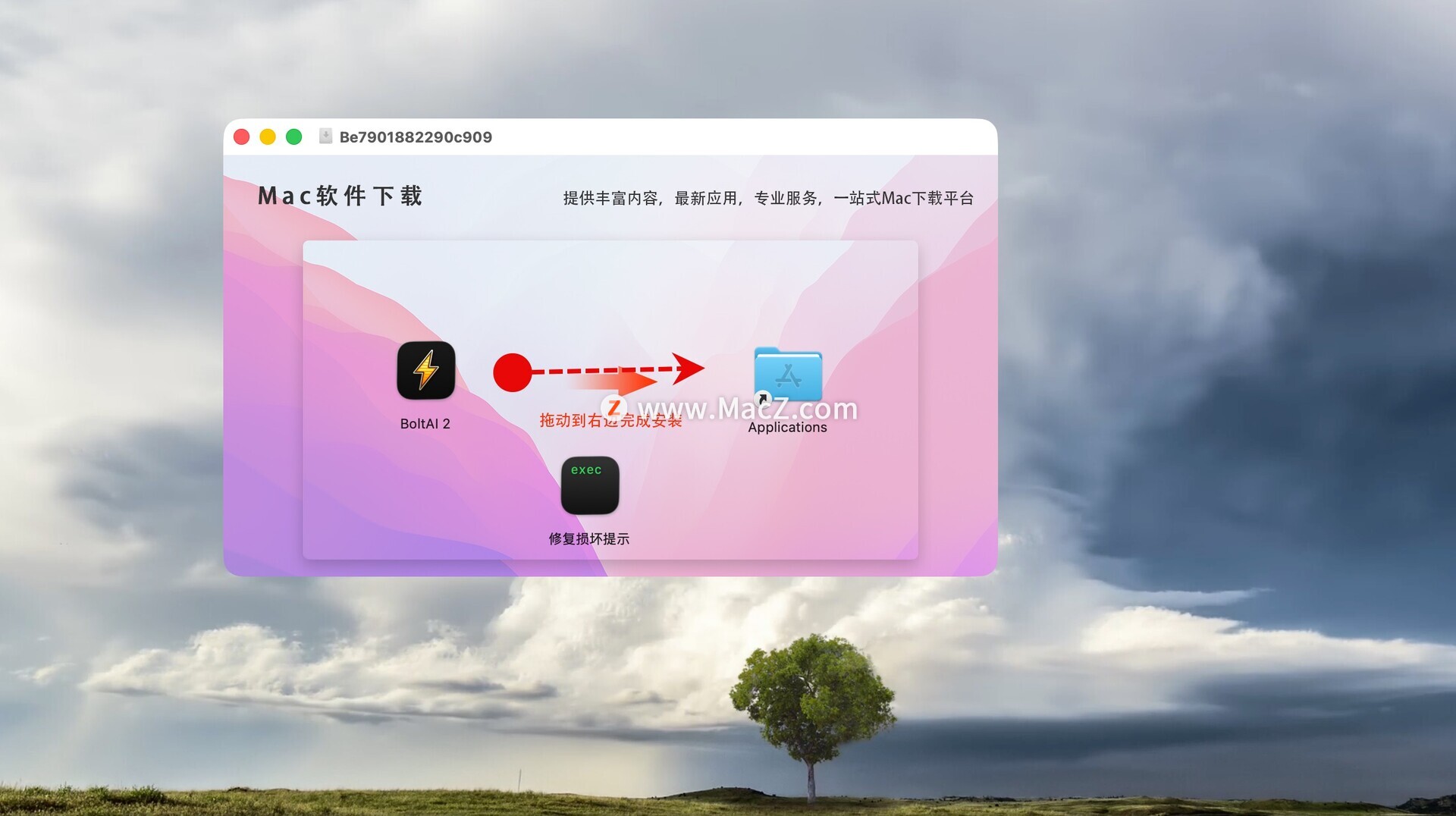 软件安装包下载完成后,拖动左侧的BoltAI到右侧应用程序中安装即可。