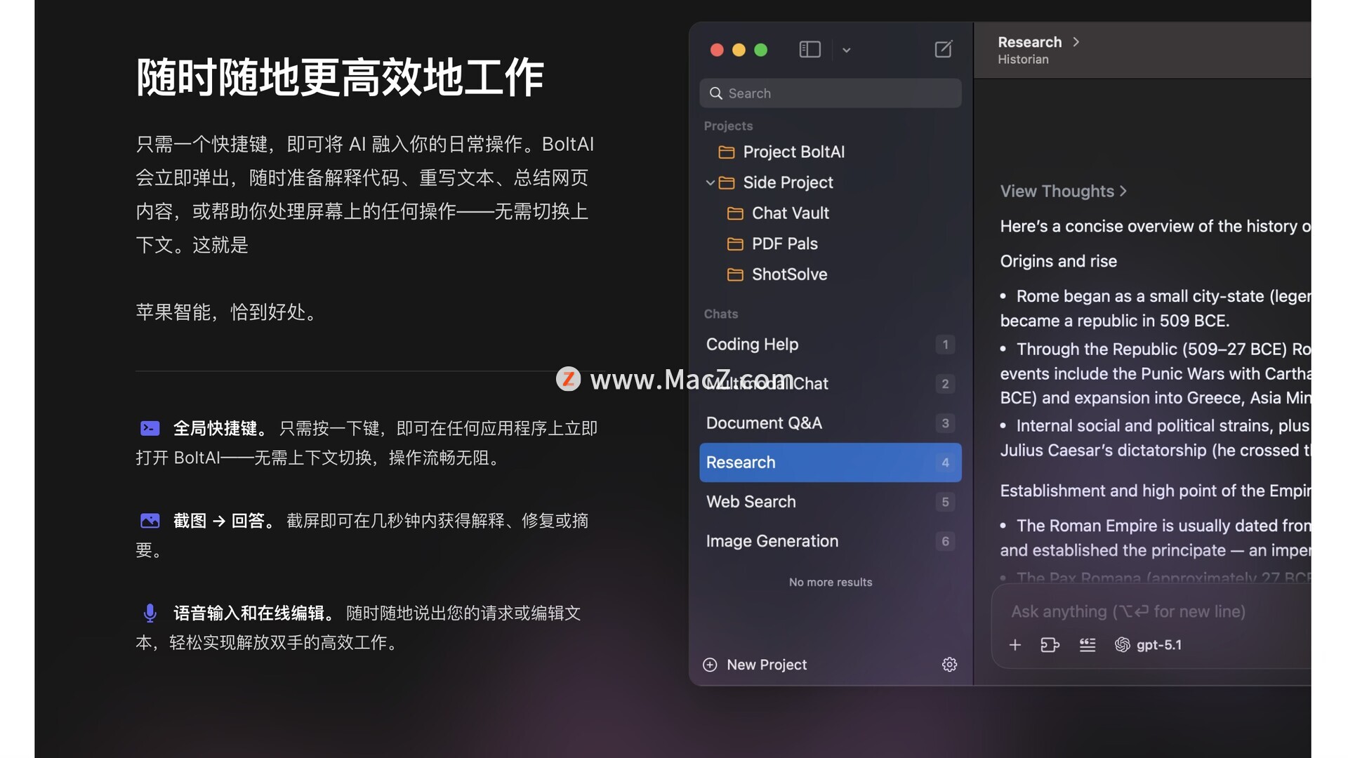 BoltAI 是一款针对macOS用户设计的强大的人工智能助手,它利用OpenAI GPT技术提供AI辅助功能,帮助用户提高各种职业领域的工作效率