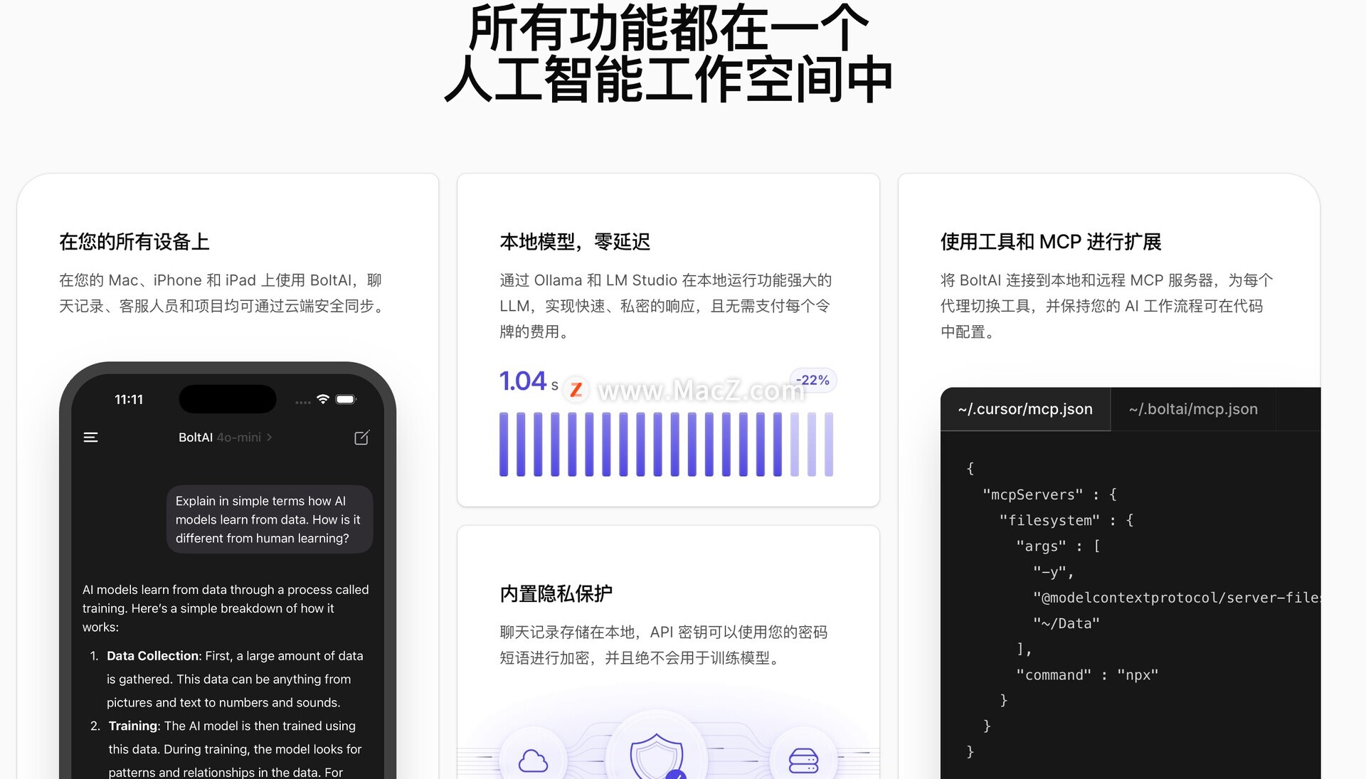 - 聊天记录存储在本地,绝不会用于训练,API 密钥可以使用您的密码短语进行加密。BoltAI 确保您的工作内容私密、安全且完全由您掌控。