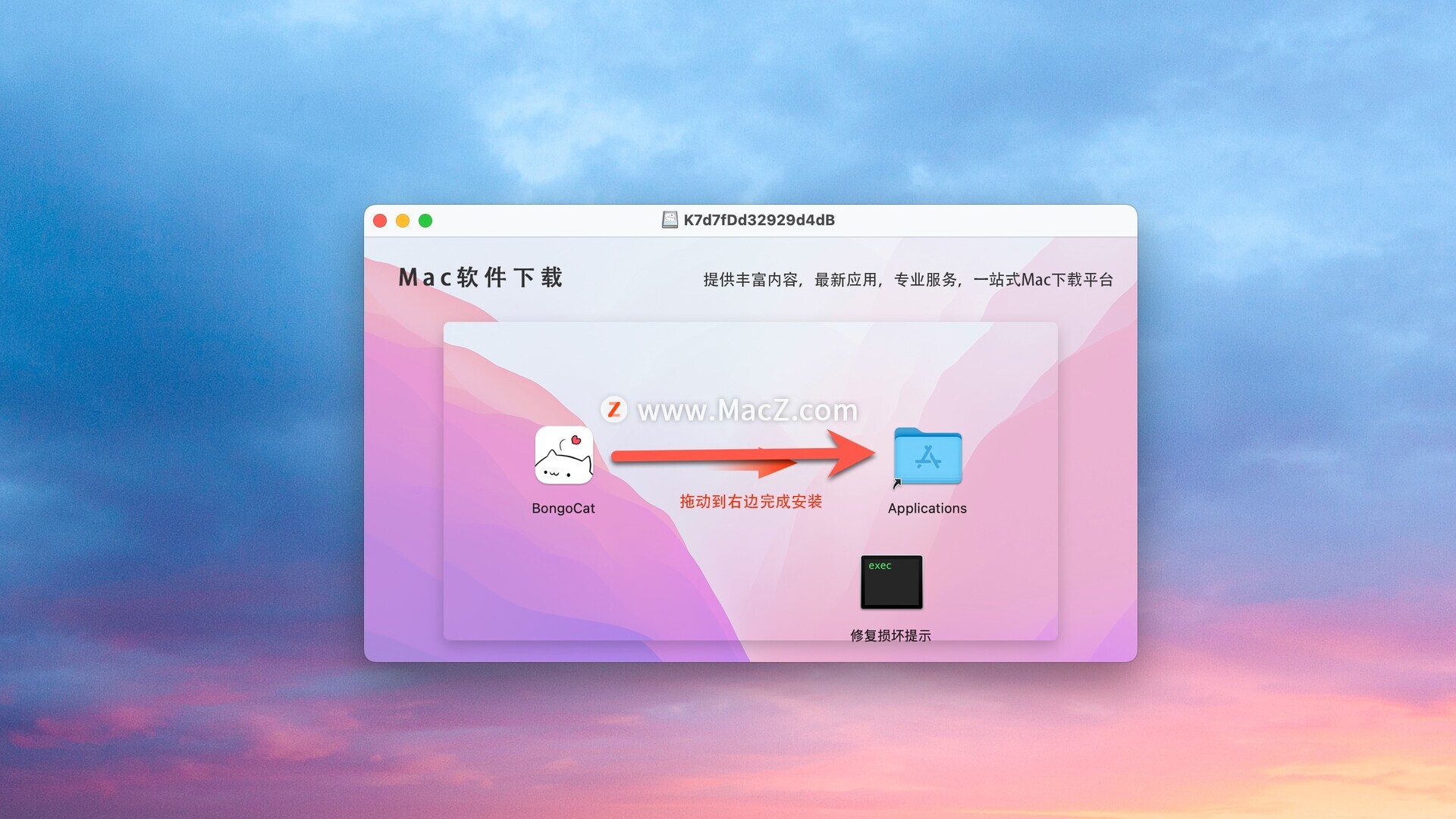 安装包下载完成后打开,将左侧文件拖动到右侧文件夹中即可
