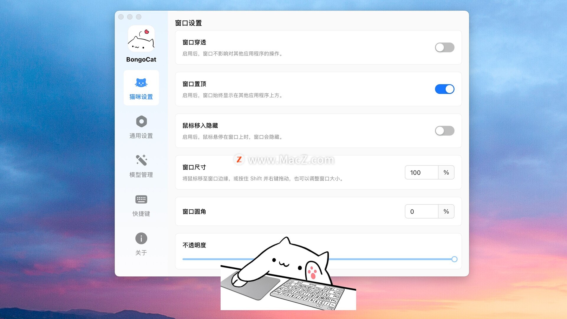 Bongo Cat是一款用于装饰直播/视频/桌面的工具,它能根据鼠标、键盘、手柄操作做出相应的动作,具有高度的可定制性。用户可以通过任务栏图标快速访问设置面板进行个性化调整,应用体积小巧,对系统资源占用极低。