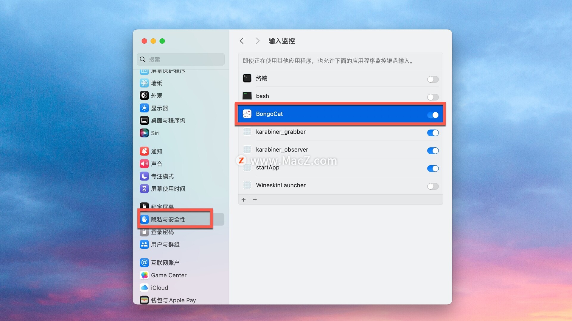 首次打开需要开启权限,打开系统设置-隐私与安全,在输入监控中开启权限