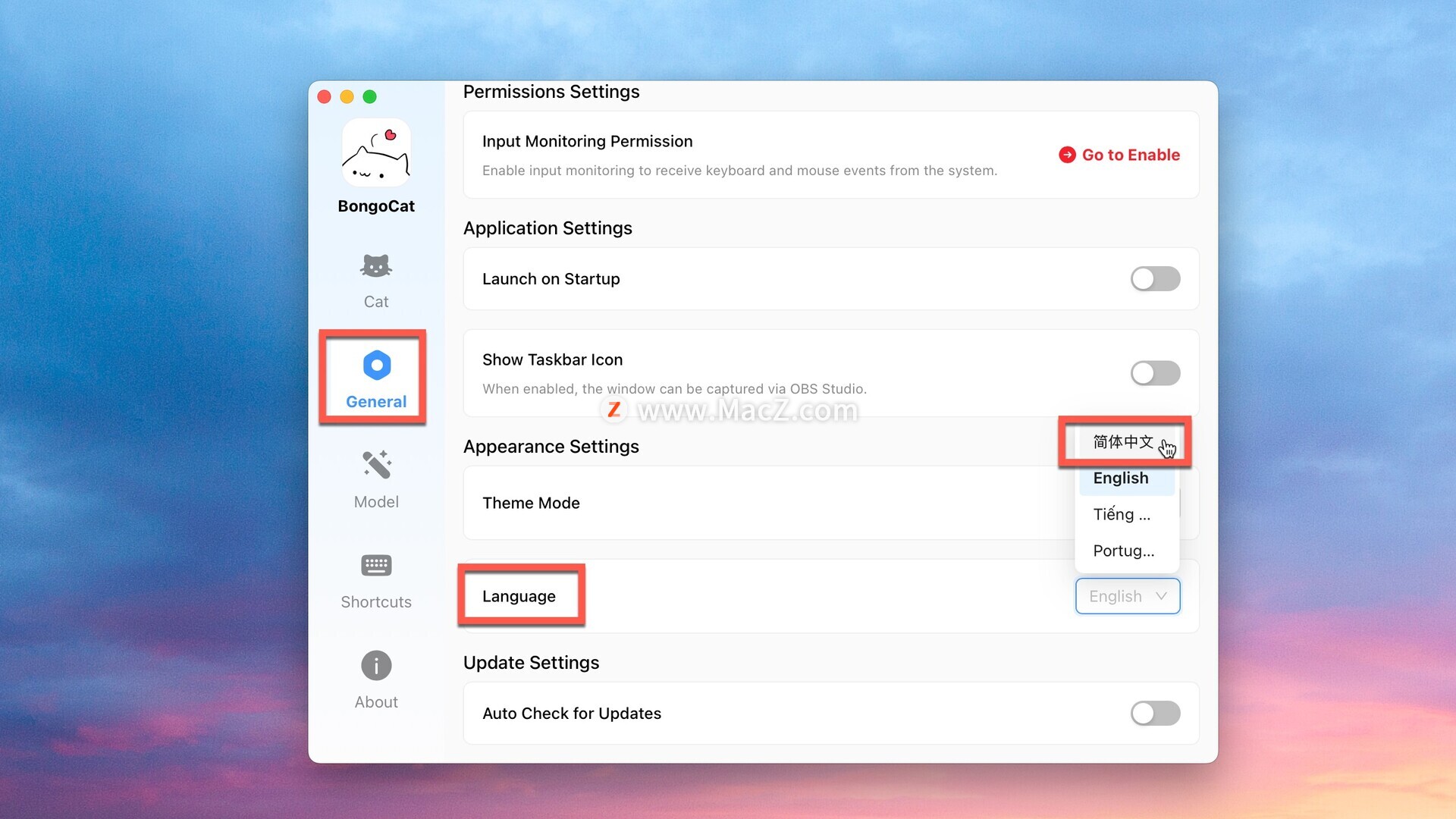 进入应用后点击左侧general-language,选择中文即可