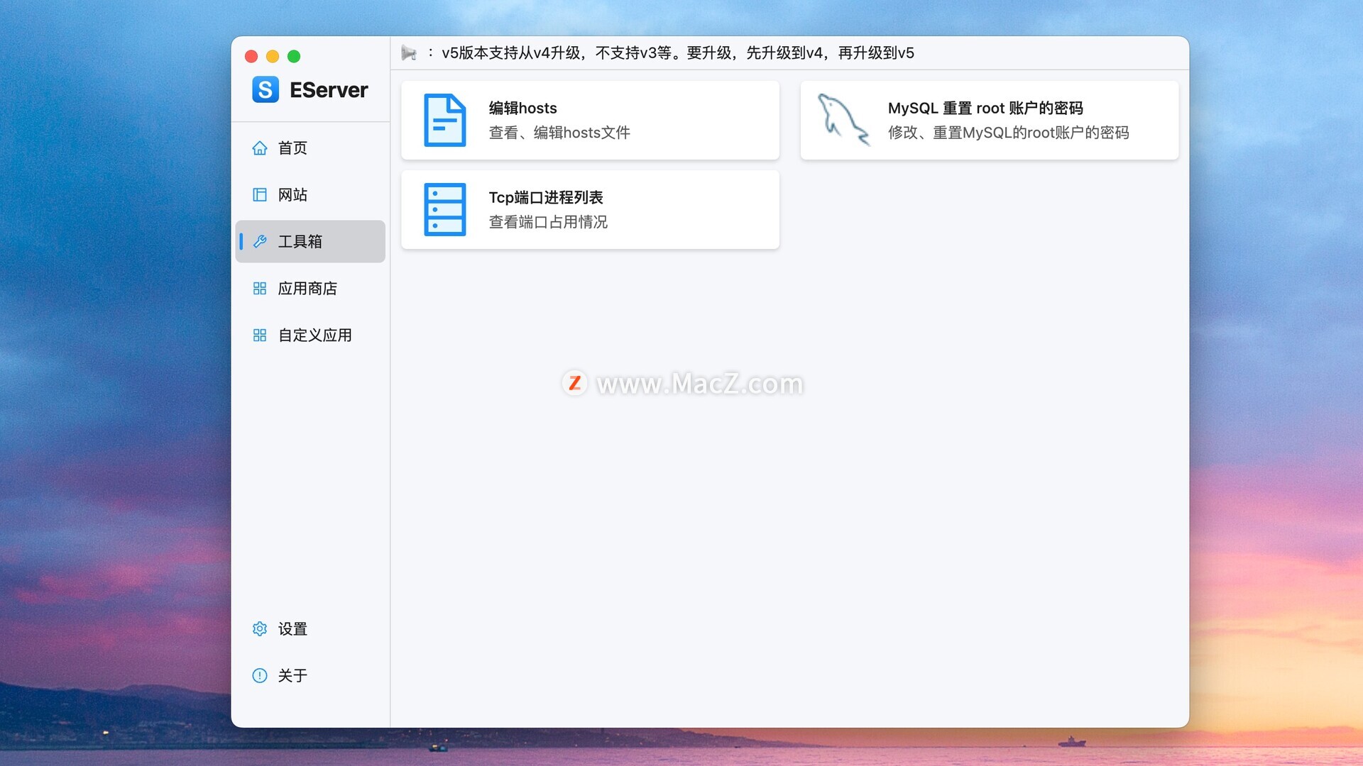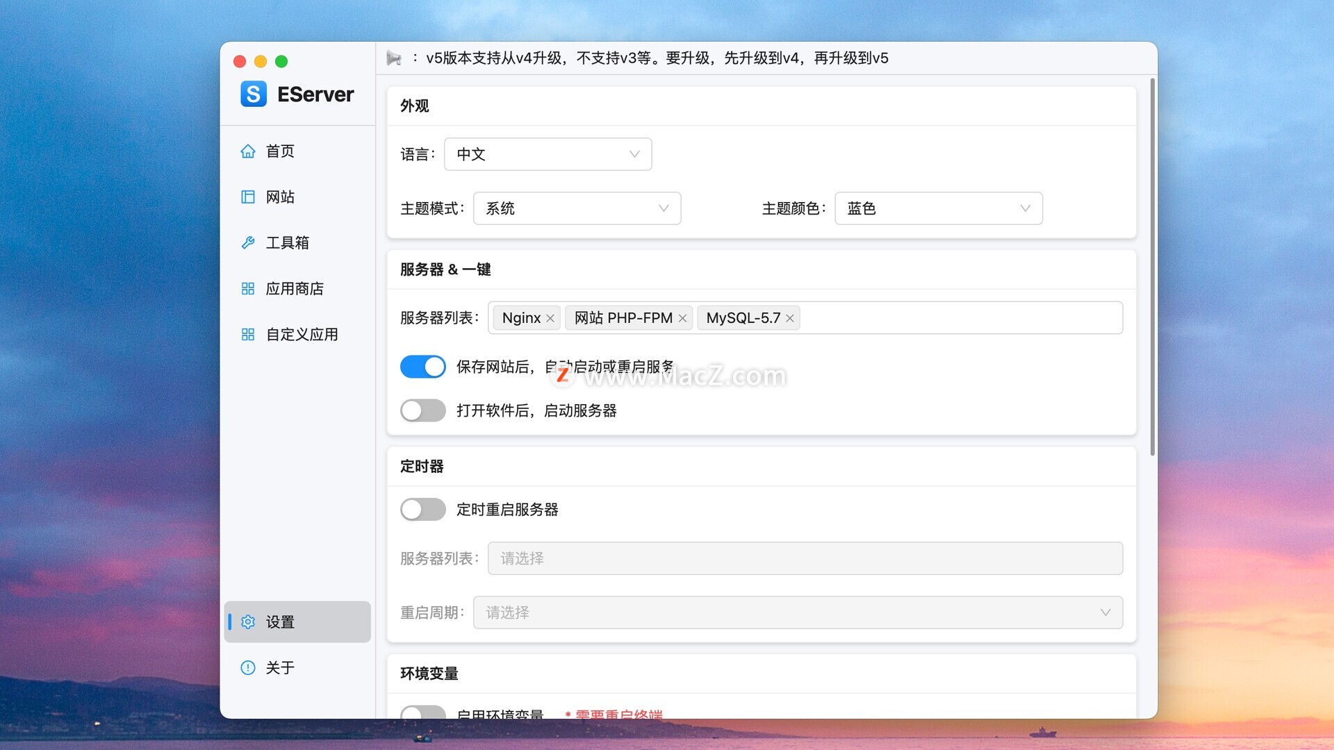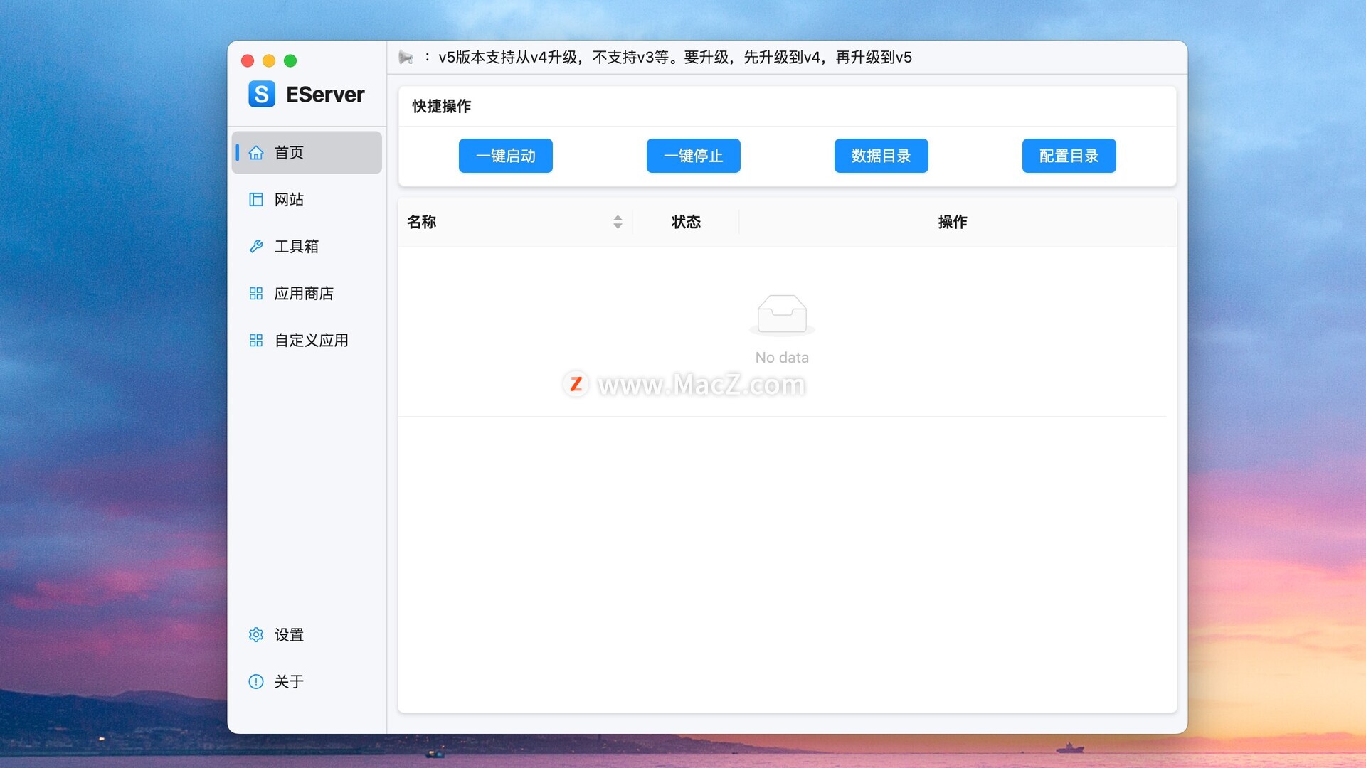 EServer是运行在MacOS系统上的绿色的PHP集成环境,集成了Apache、Nginx等Web组件。支持不同PHP版本共存,支持自定义PHP版本,自定义MySQL版本。主打开发环境,也可以用作服务器环境。拥有清除PHP环境阻碍、解除端口占用、支持切换MySQL、强制修改MySQL密码,兼容其他集成环境,内置Redis、Composer和功能强大的命令行、本地Tcp端口进程列表等实用功能。