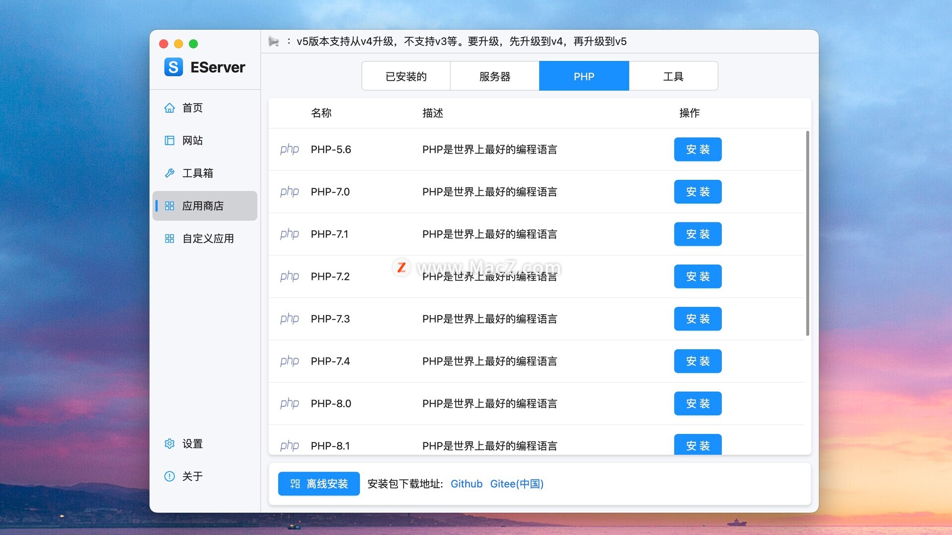 软件商店想下什么版本就有什么版本,支持不同php版本共存。
