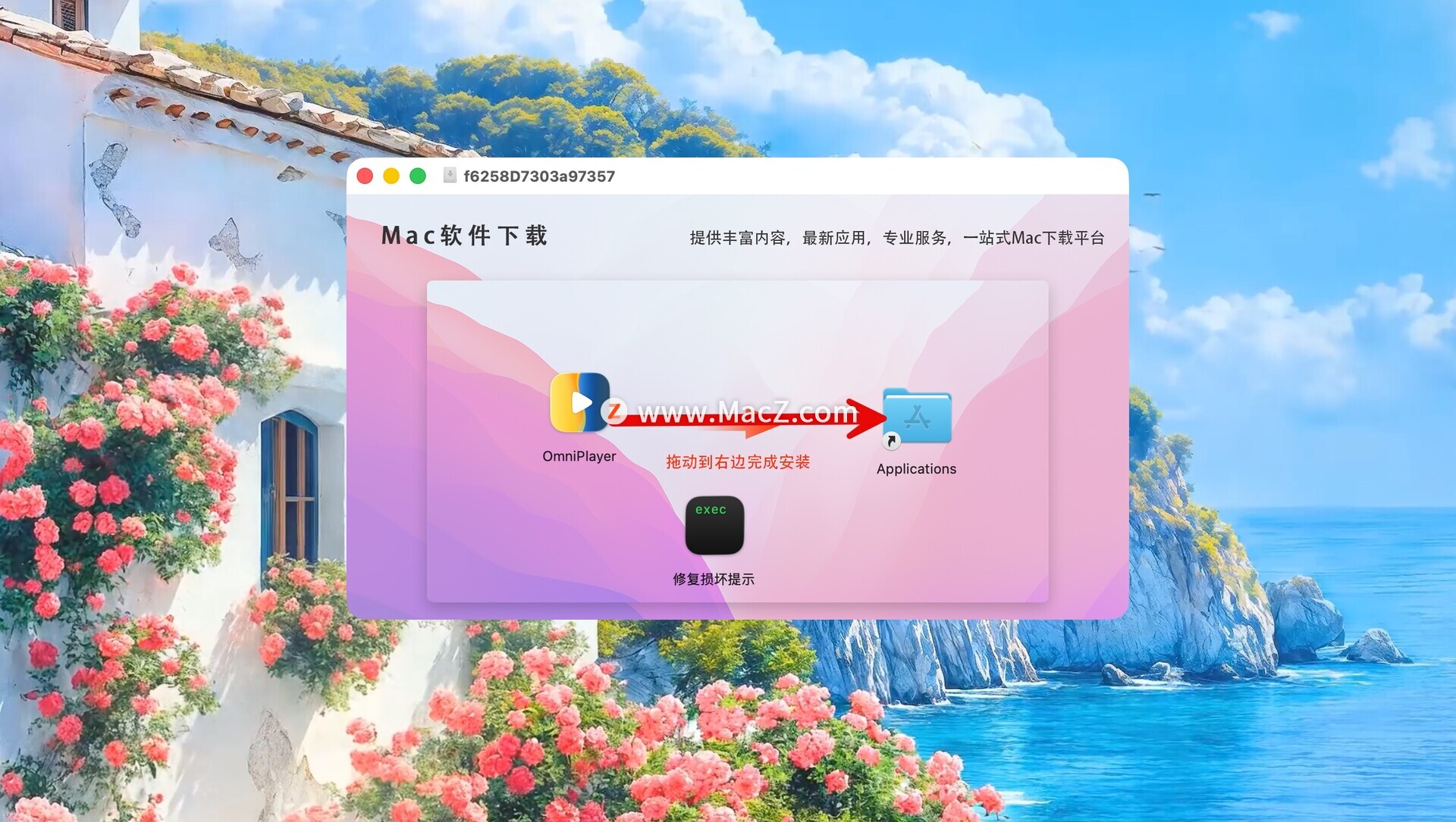 OmniPlayer下载完成后打开,拖动左侧的软件到右侧应用程序中即可