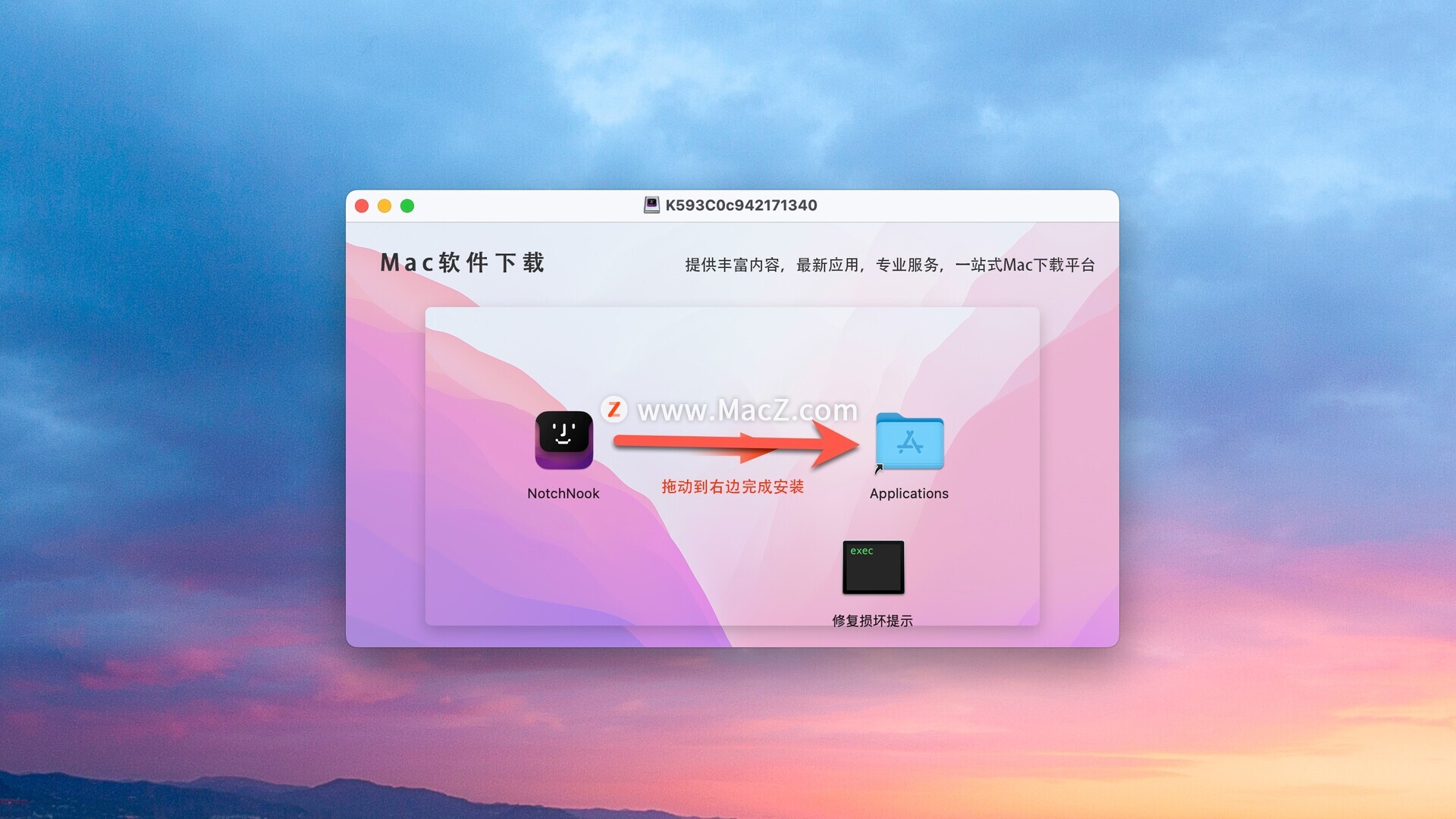 安装包下载完成后打开,将左侧应用拖动到右侧文件夹中即可