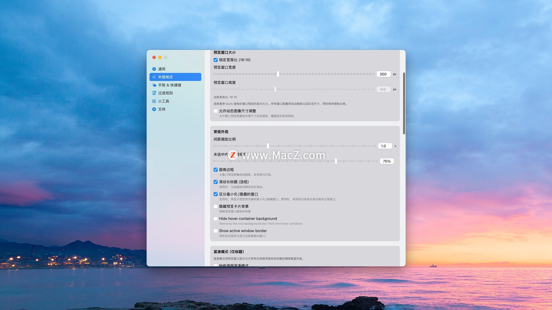 在窗口预览中使用双指滑动来控制窗口。向 Dock 栏方向滑动可最小化窗口,向外滑动可最大化窗口。手势方向会根据 Dock 栏的位置自动调整。您可以在“设置”→“手势与快捷键”中配置操作。