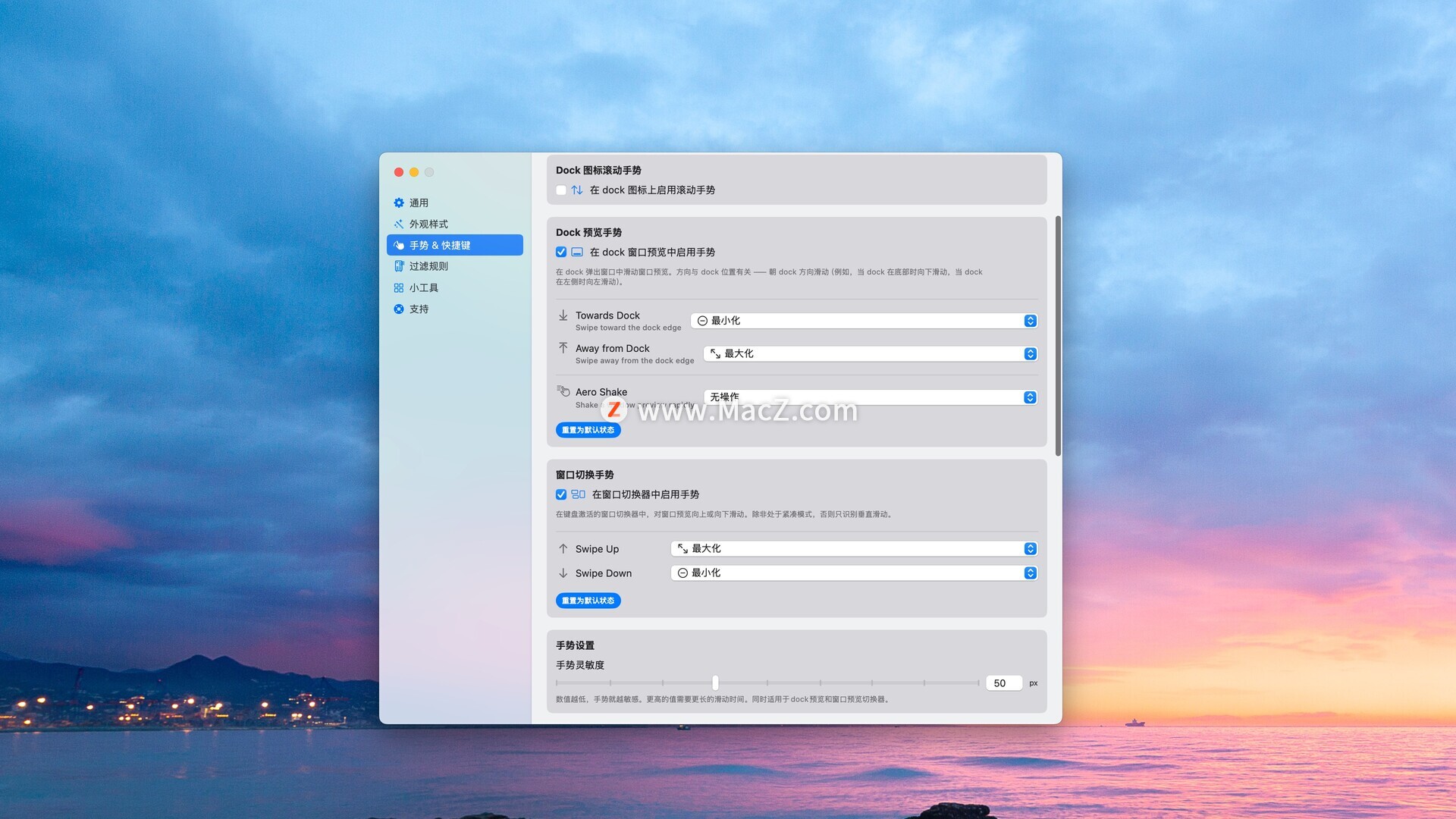 向上滚动任意 Dock 图标即可将应用置于最前,向下滚动即可隐藏所有窗口。支持触控板、妙控鼠标或任何滚轮设备。在“设置”→“手势与快捷键”→“Dock 图标滚动手势”部分启用此功能。