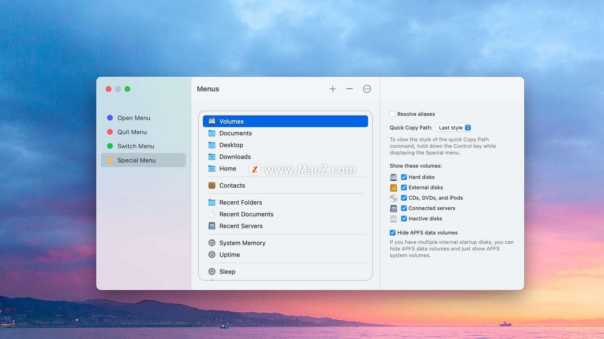 应用程序向导的“特殊”菜单允许您浏览卷和常用文件夹,以便快速打开其中包含的项目。它还允许您预览文档,并轻松访问最近使用的文件夹和文件、软件包内容以及联系人。