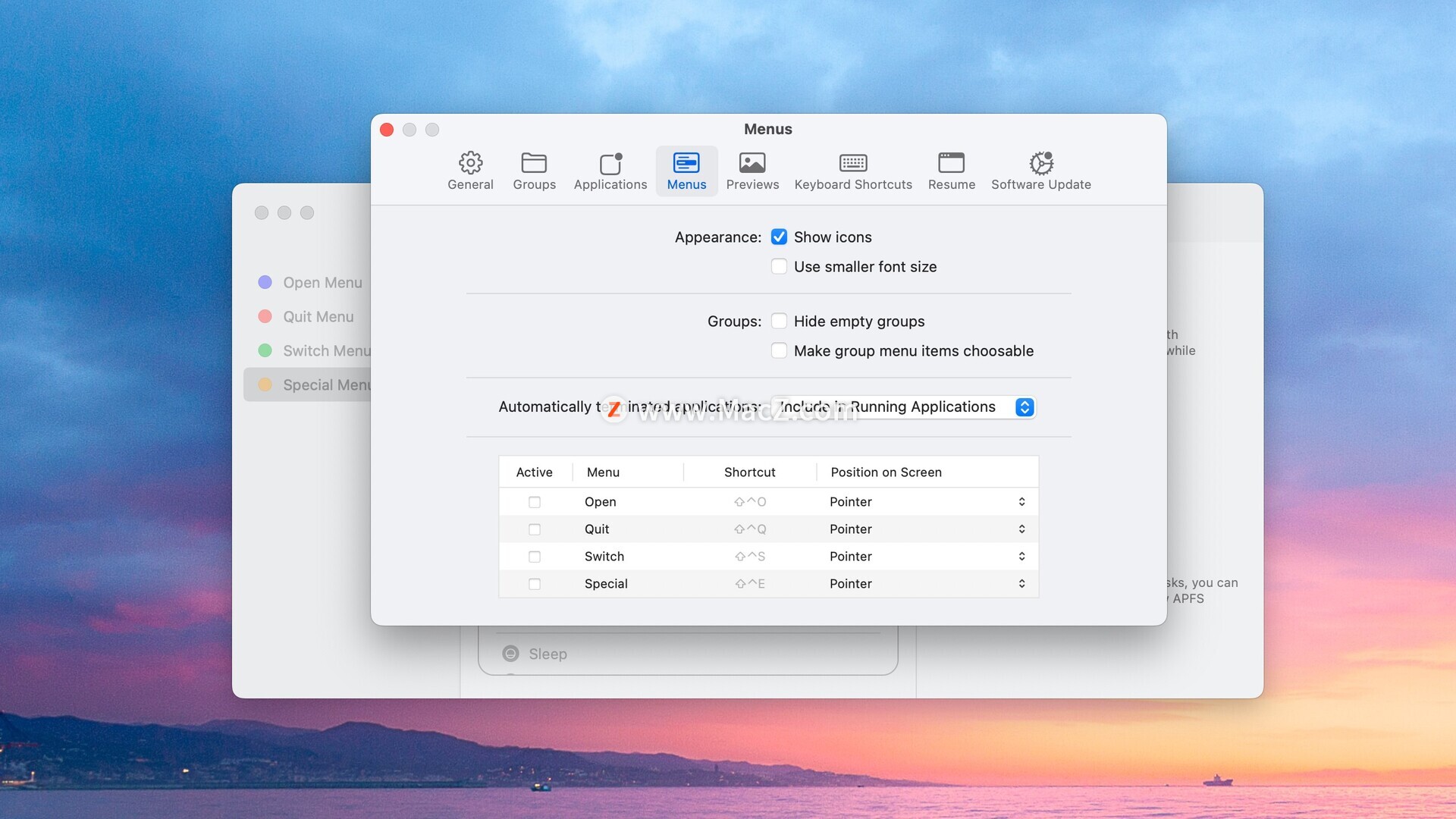 应用程序向导的切换菜单允许您在应用程序之间切换,轻松重新打开自动终止的应用程序,以及显示或隐藏单个或多个应用程序。