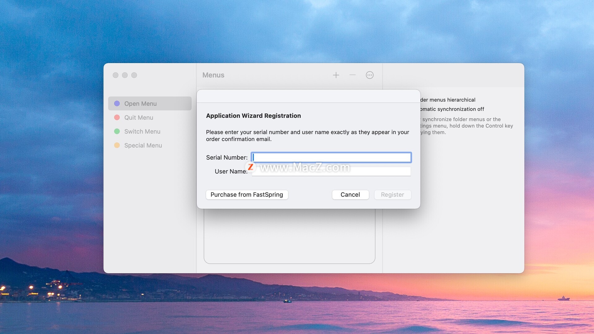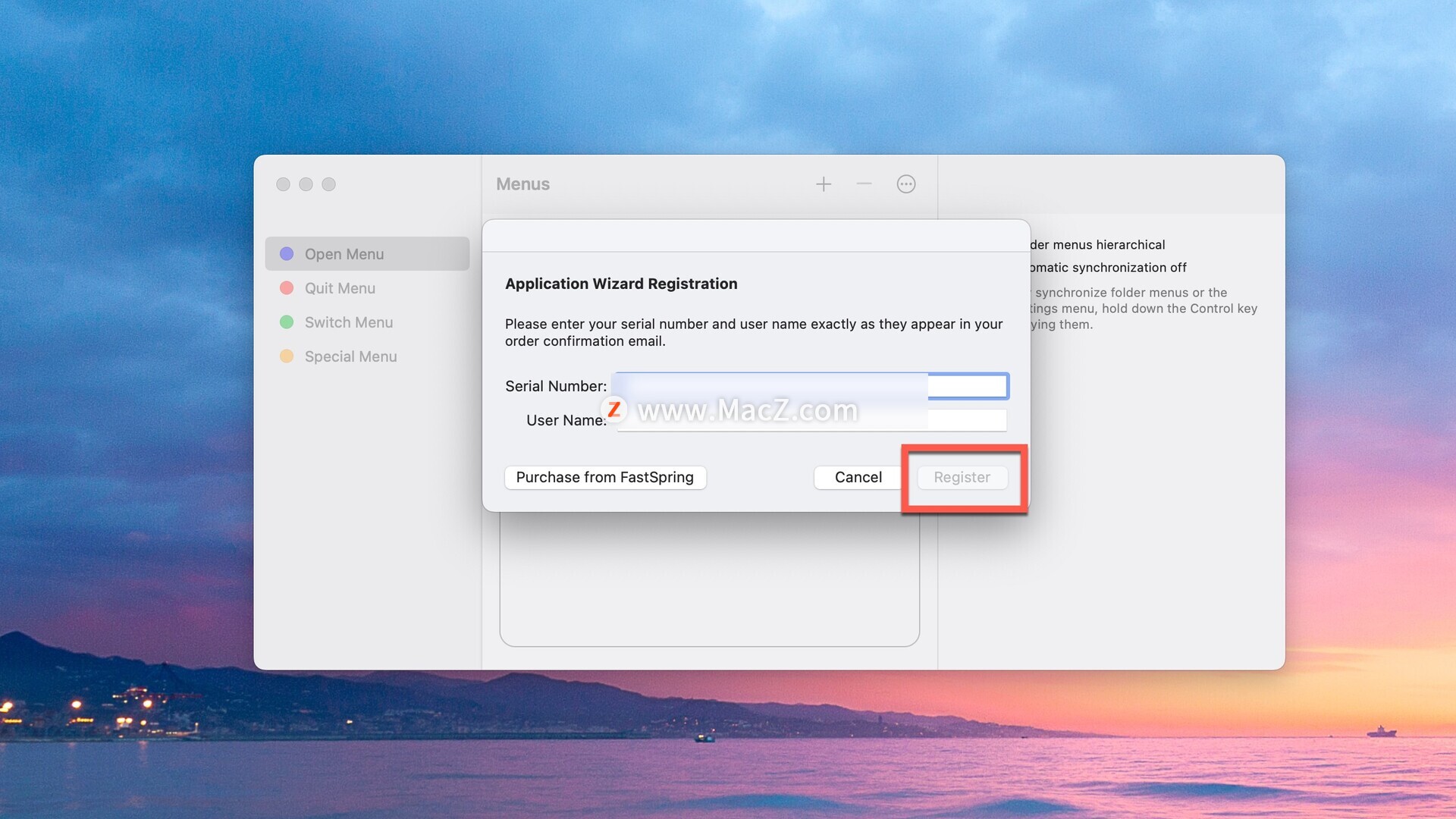 打开软件,点击菜单栏左上角-registration