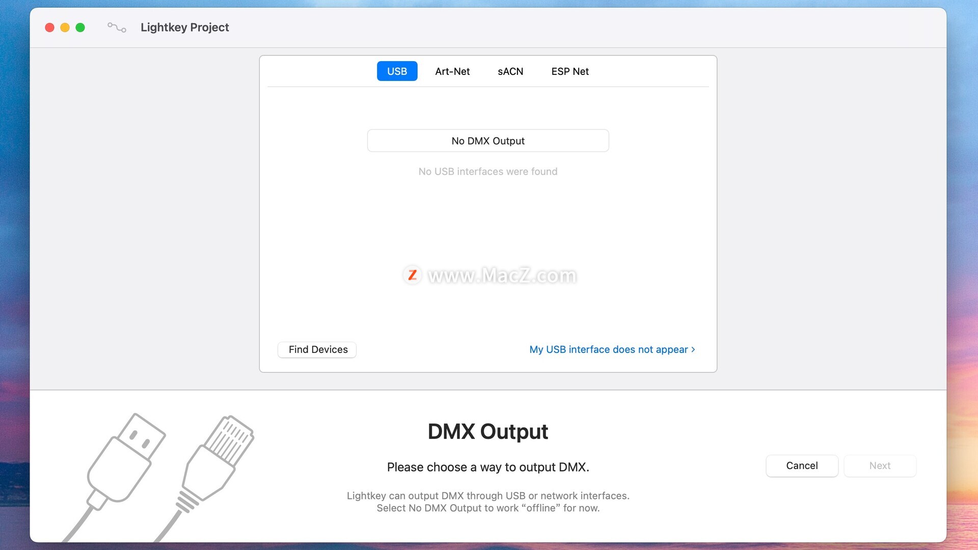 无需购买昂贵的专用DMX硬件:Lightkey兼容多种USB接口以及任何Art-Net、sACN或ESP-Net兼容设备,这得益于其开放照明架构。无论您使用哪种DMX接口,Lightkey很可能都支持它——只需下载Lightkey,连接您的接口,即可体验。