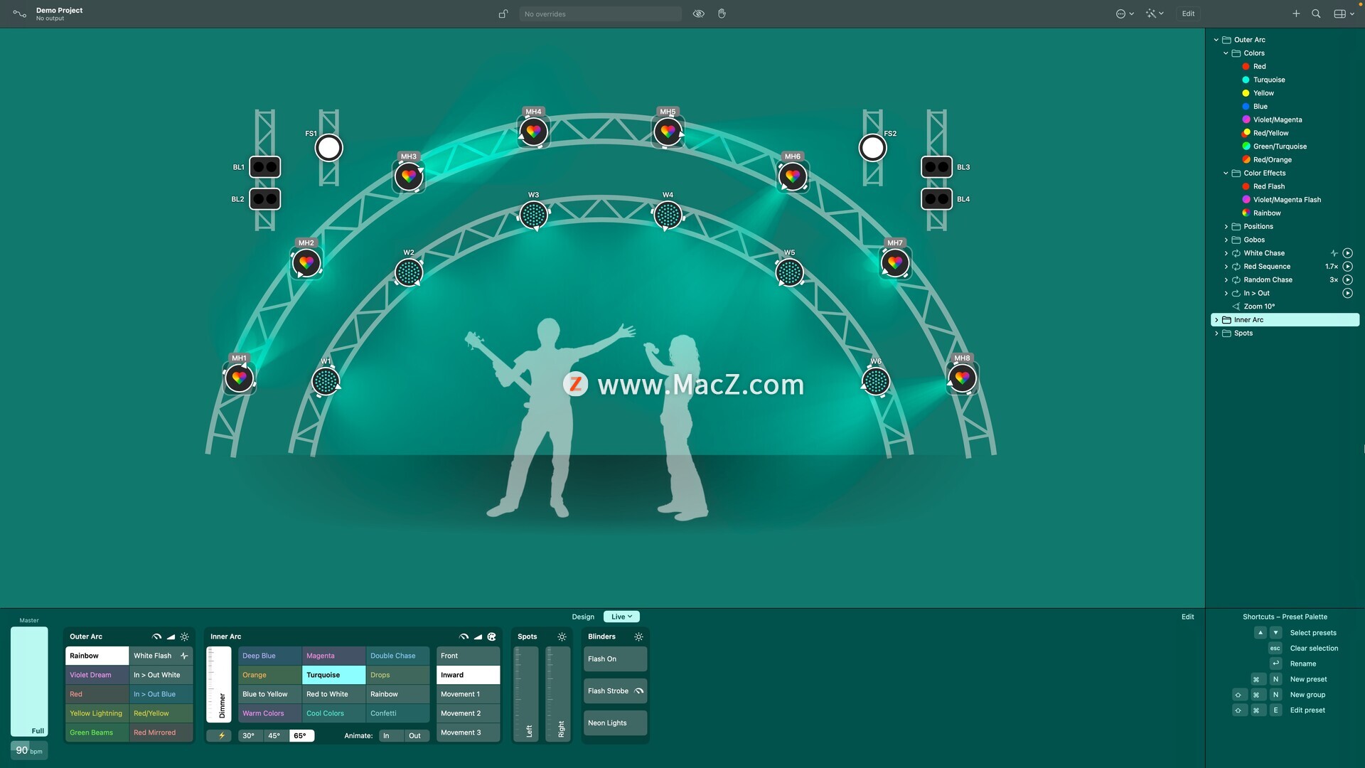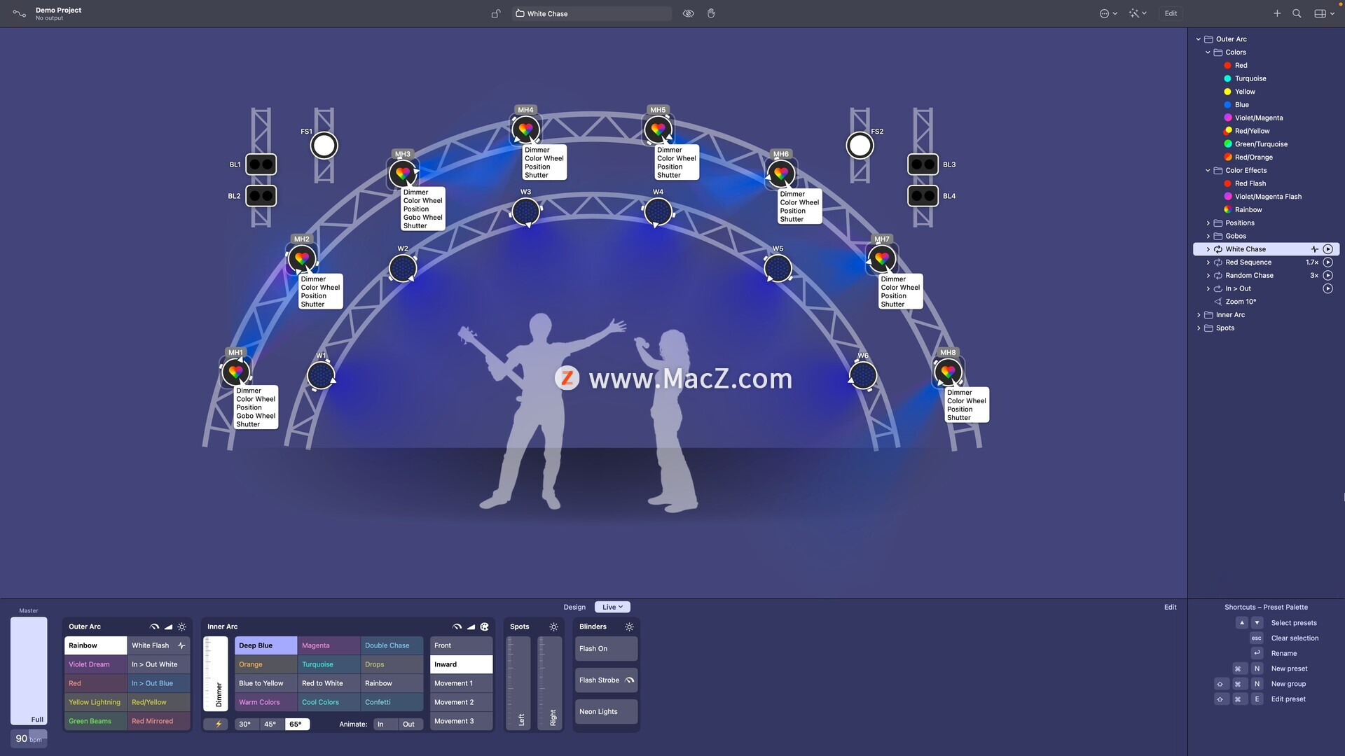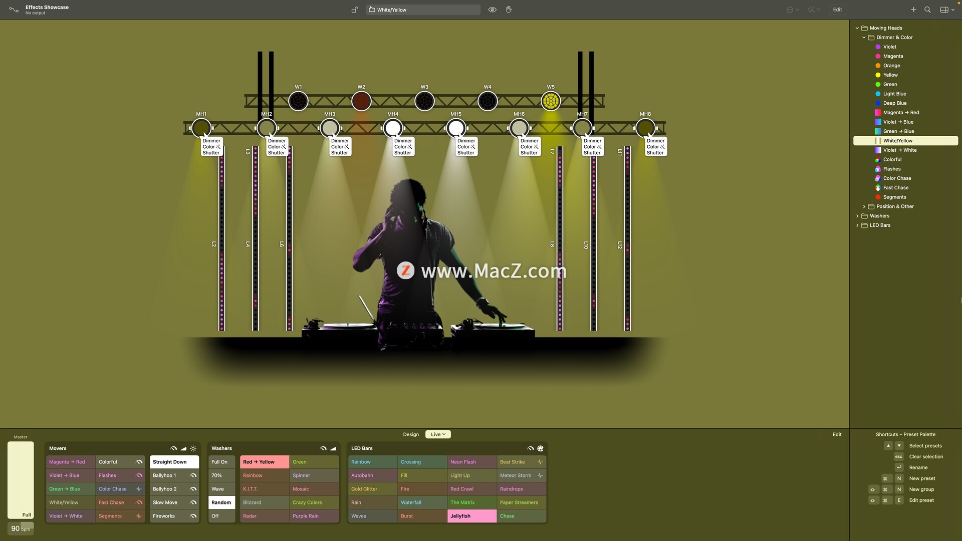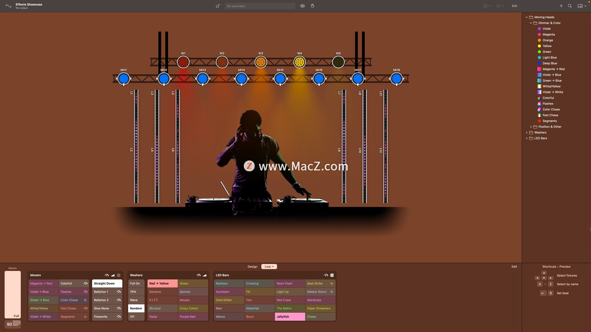 随时快速更改任何固定装置属性——非常适合夜总会和派对,因为您事先没有歌曲清单。