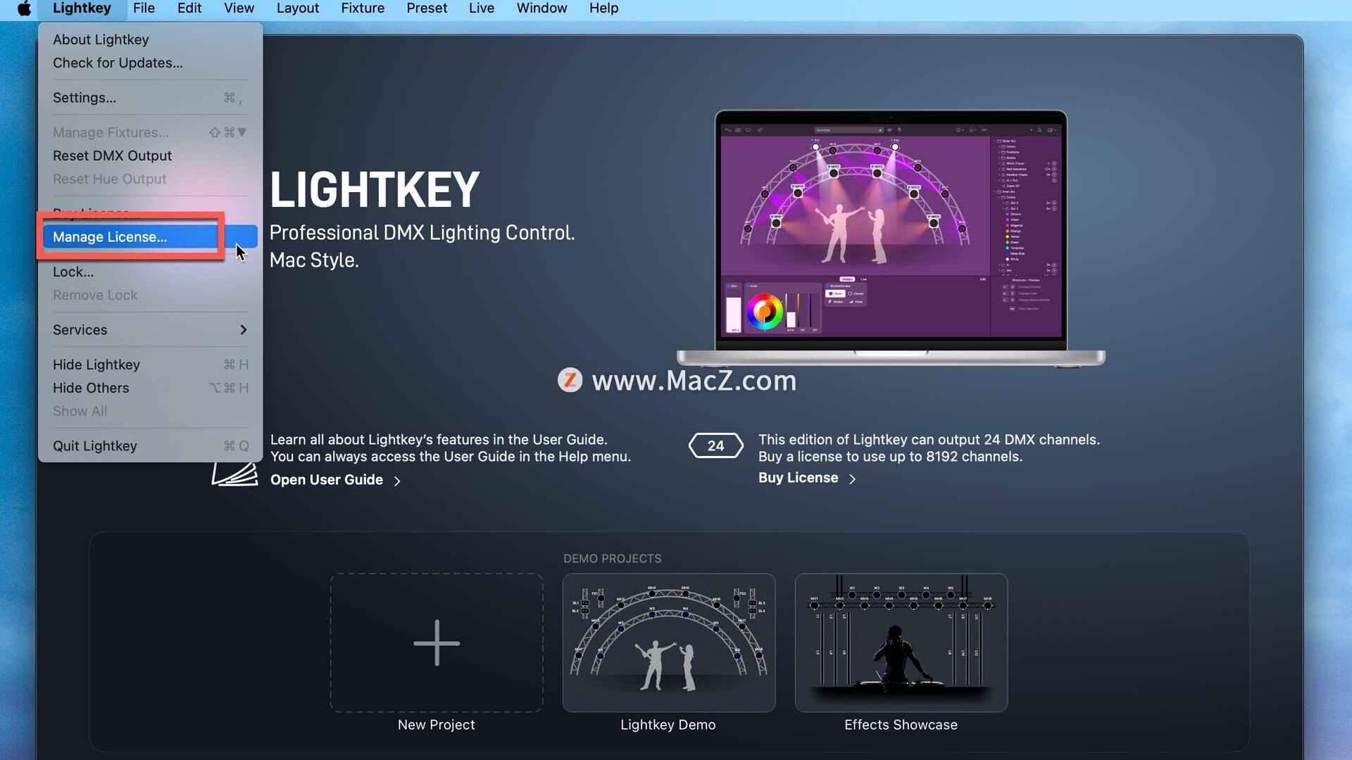 打开应用程序,点击菜单栏-Lightkey-manage license