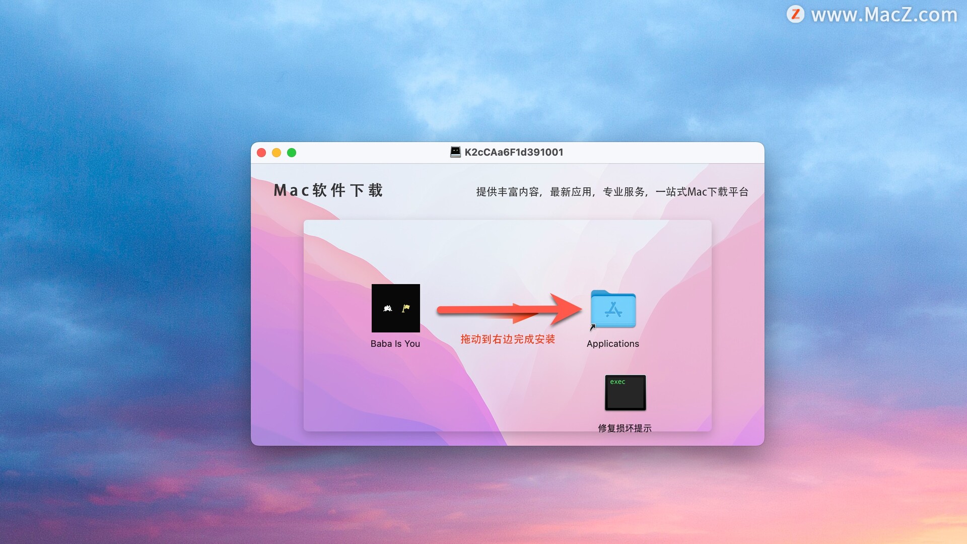 安装包下载完成后打开,将左侧应用拖动到右侧文件夹中即可