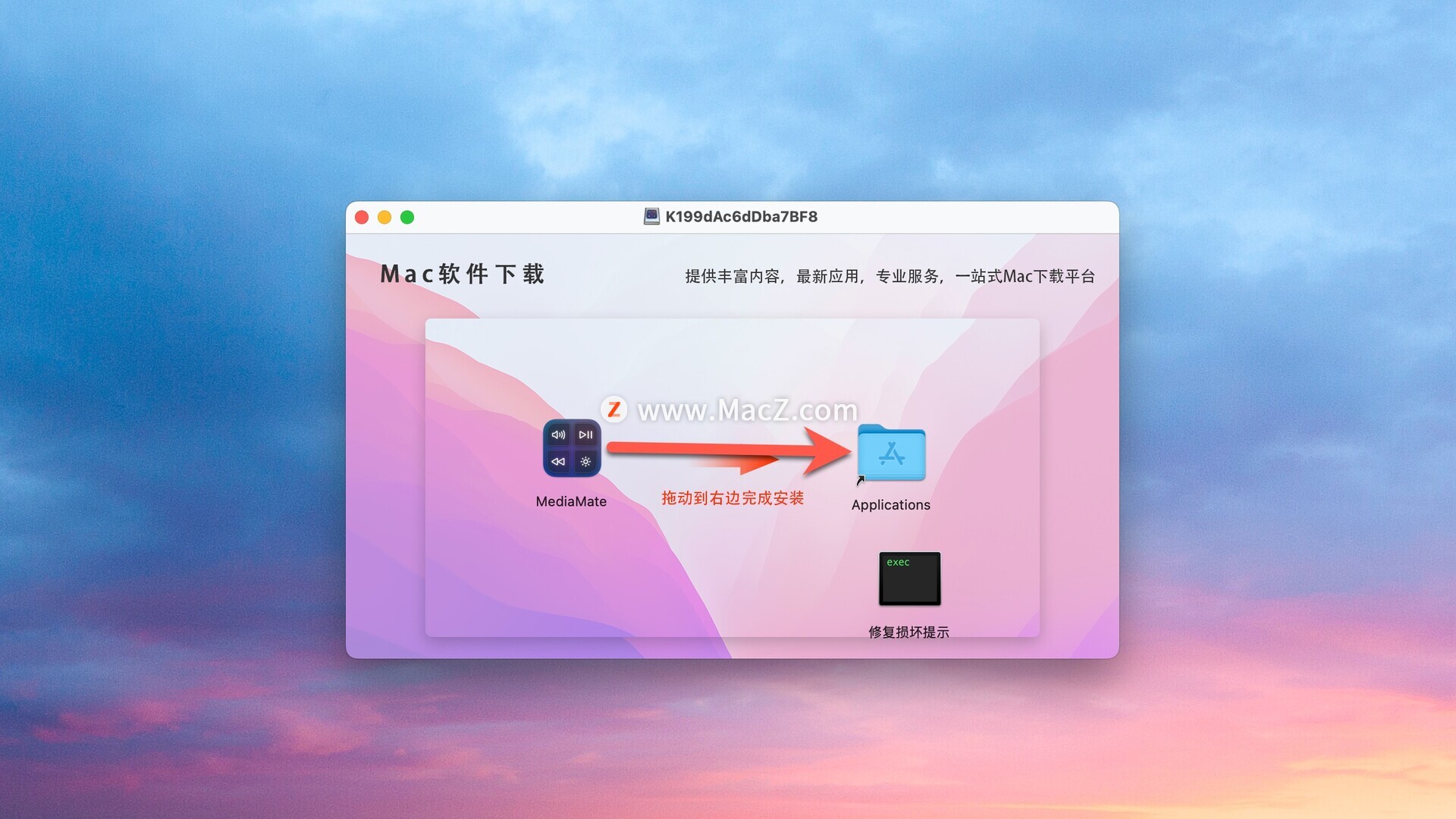 本站下载完成后,将左侧软件拖动到右侧应用程序即可
