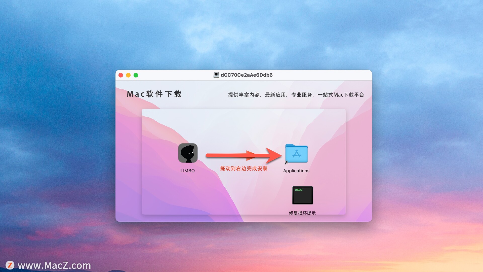 安装包下载完成后打开,将左侧文件拖动到右侧文件夹中即可