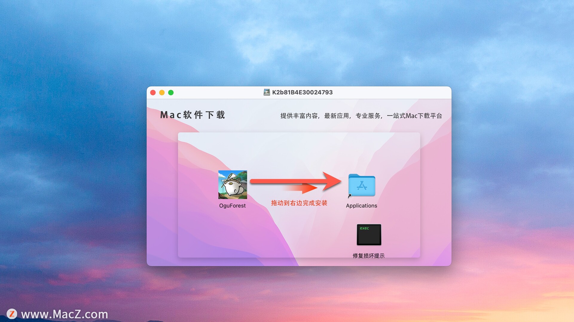 安装包下载完成后打开,将拖动到右侧文件夹中即可