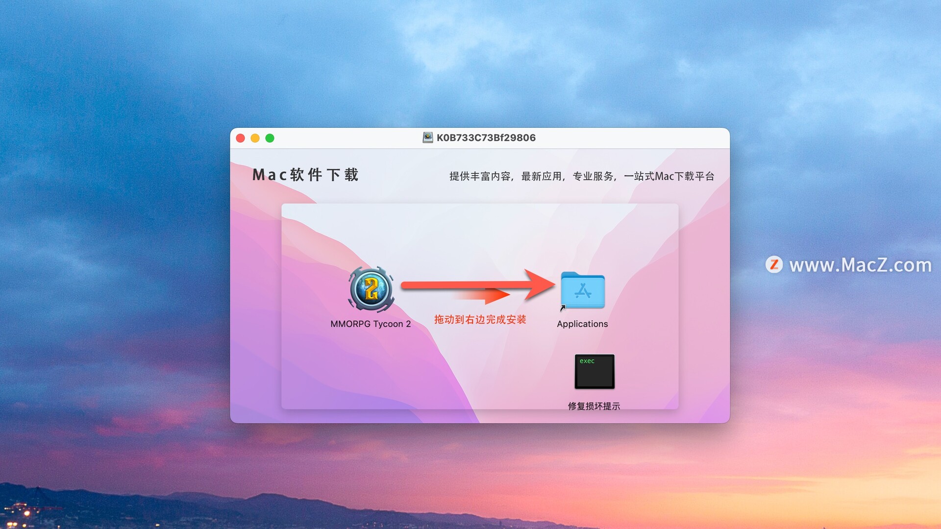 安装包下载完成后打开,将拖动到右侧文件夹中即可