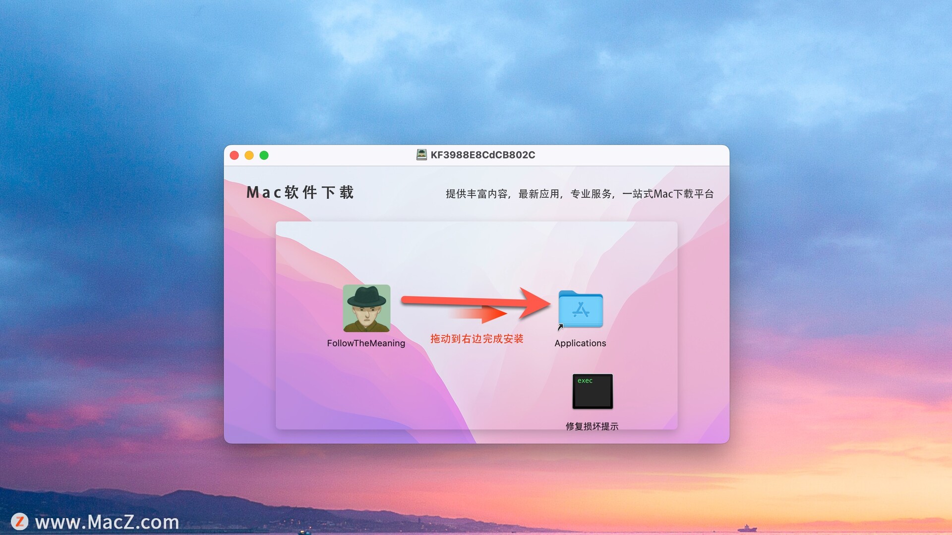 安装包下载完成后打开,将Follow the meaning拖动到右侧文件夹中即可