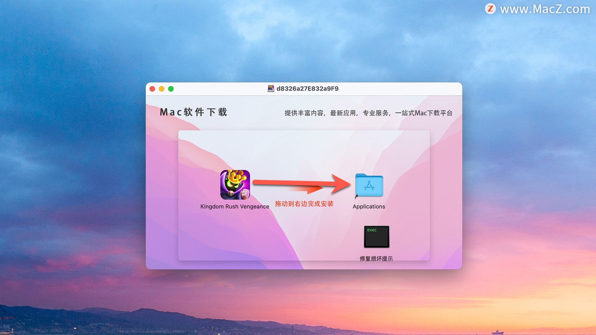 安装包下载完成后打开,将Kingdom Rush Vengeance拖动到右侧文件夹中即可