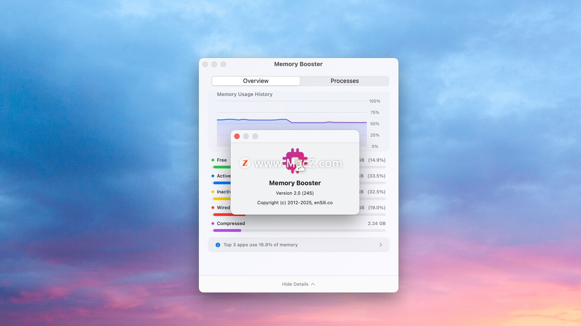 启动 Memory Booster,通过精美的图表和详细的分析,实时查看 Mac 的内存使用情况。准确了解 RAM 的去向。
