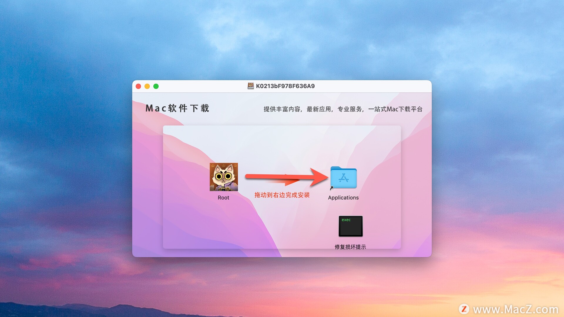安装包下载完成后打开,将Root拖动到右侧文件夹中即可
