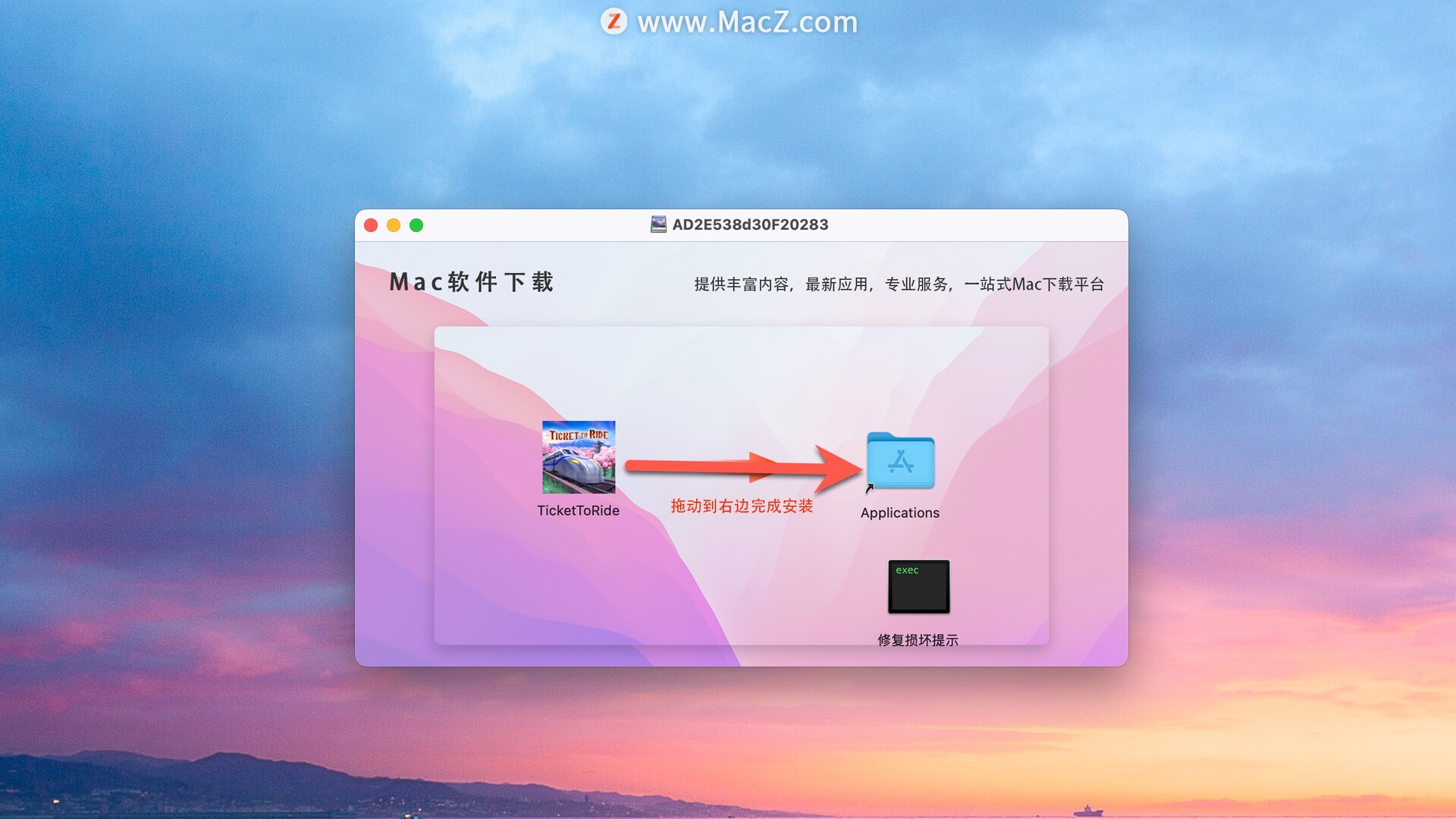 安装包下载完成后打开,将Ticket to Ride拖动到右侧文件夹中即可