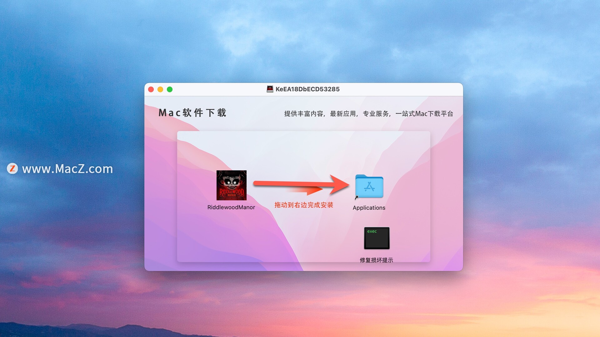 安装包下载完成后打开,将Riddlewood Manor 拖动到右侧文件夹中即可
