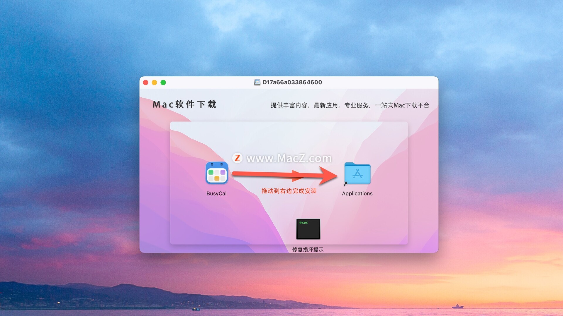 安装包下载完成后打开,将BusyCal拖动到右侧文件夹中即可