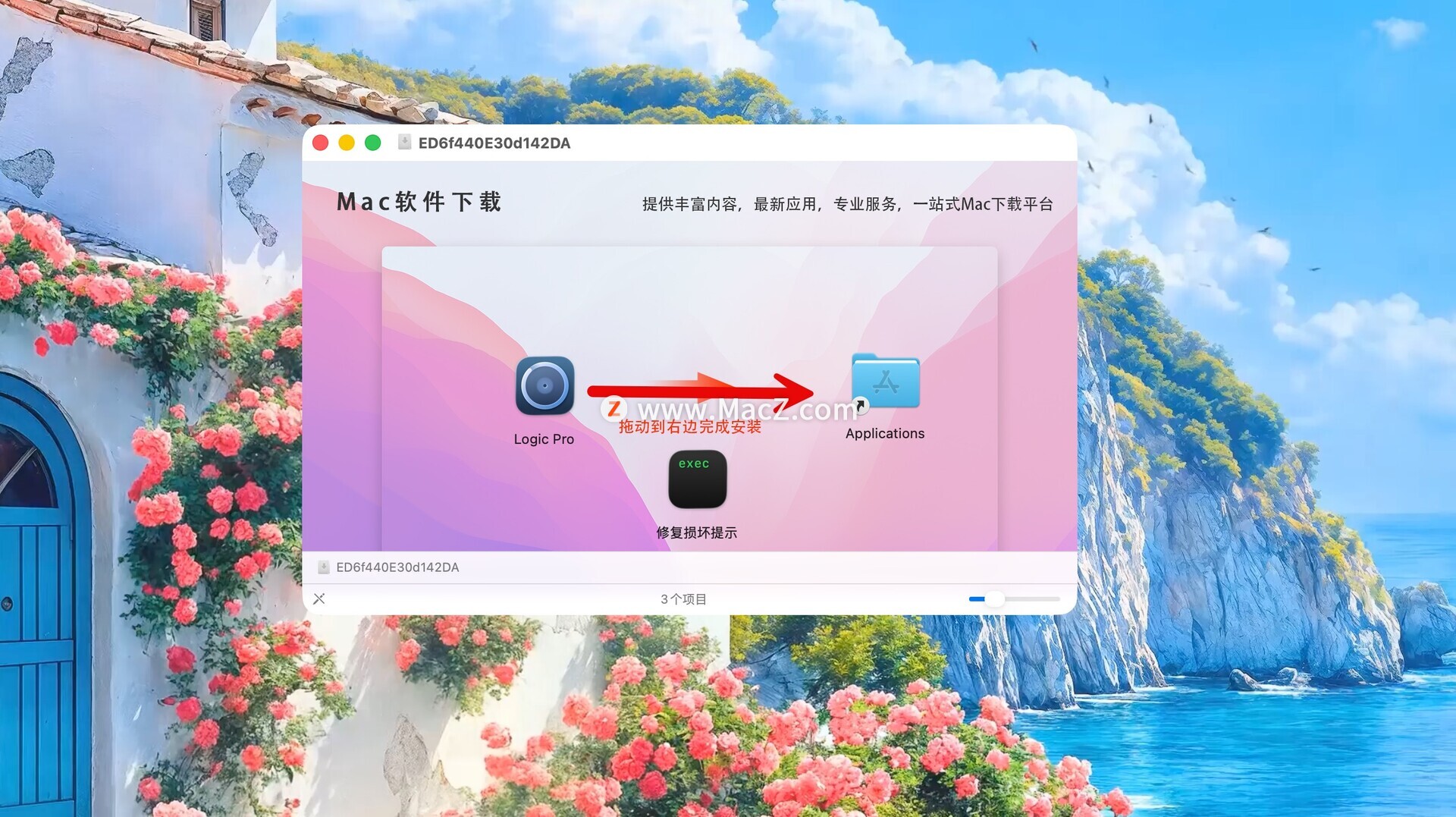 将左侧的Logic Pro X 拖动到右侧的应用程序中即可,如图