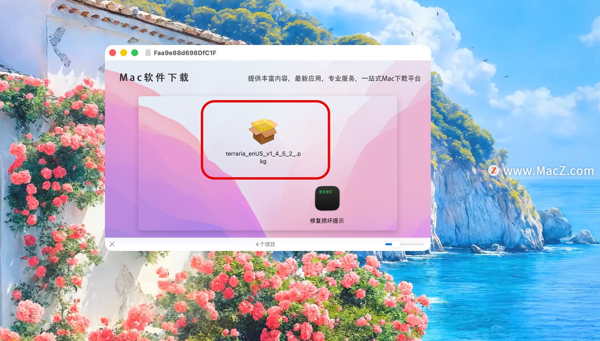 泰拉瑞亚游戏中文版下载完成后打开,双击【Terraria.pkg】进行安装即可!