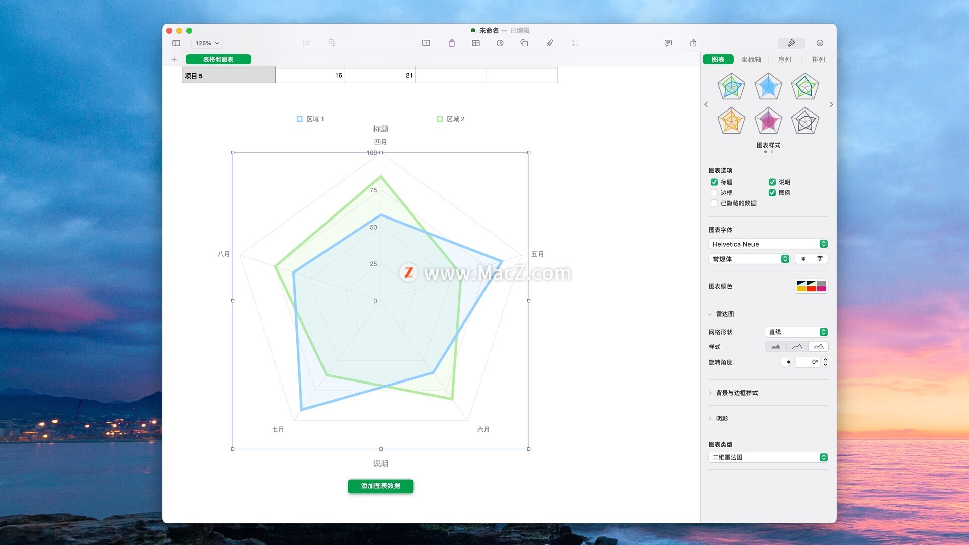 • 插入精美的 2D 和 3D 图表,包括条形图、柱形图、折线图、面积图、饼图等环形图和雷达图