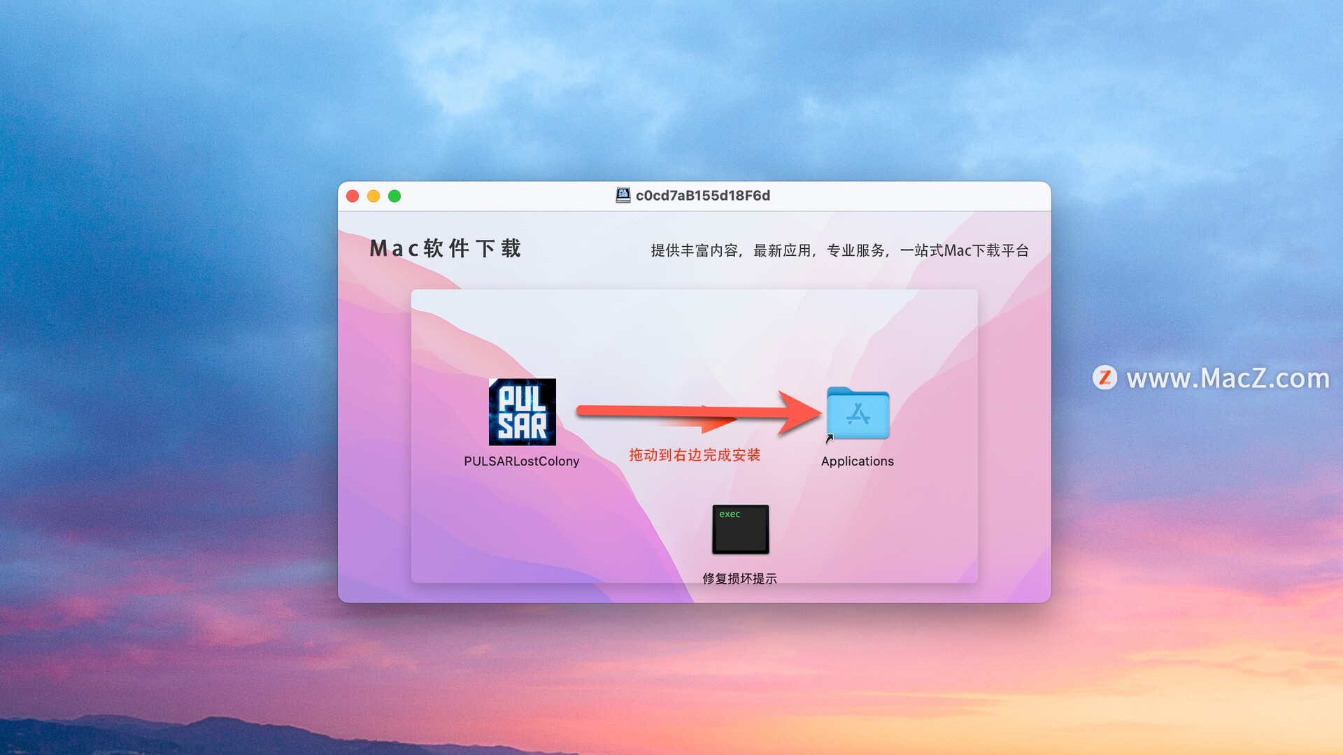 安装包下载完成后打开,将PULSAR: Lost Colony拖动到右侧文件夹中即可