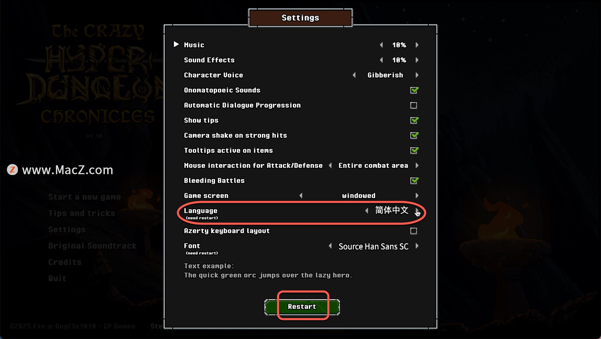 在language中将语言切换至中文点击restart即可
