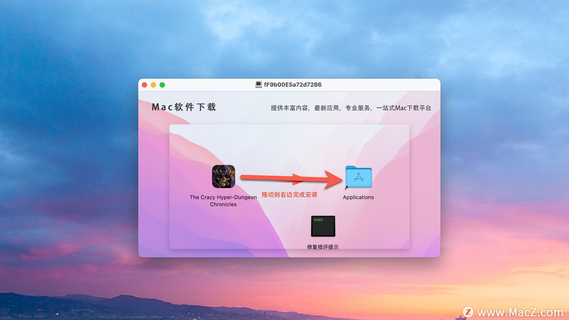 安装包下载完成后打开,将The Crazy Hyper-Dungeon Chronicles拖动到右侧文件夹中即可